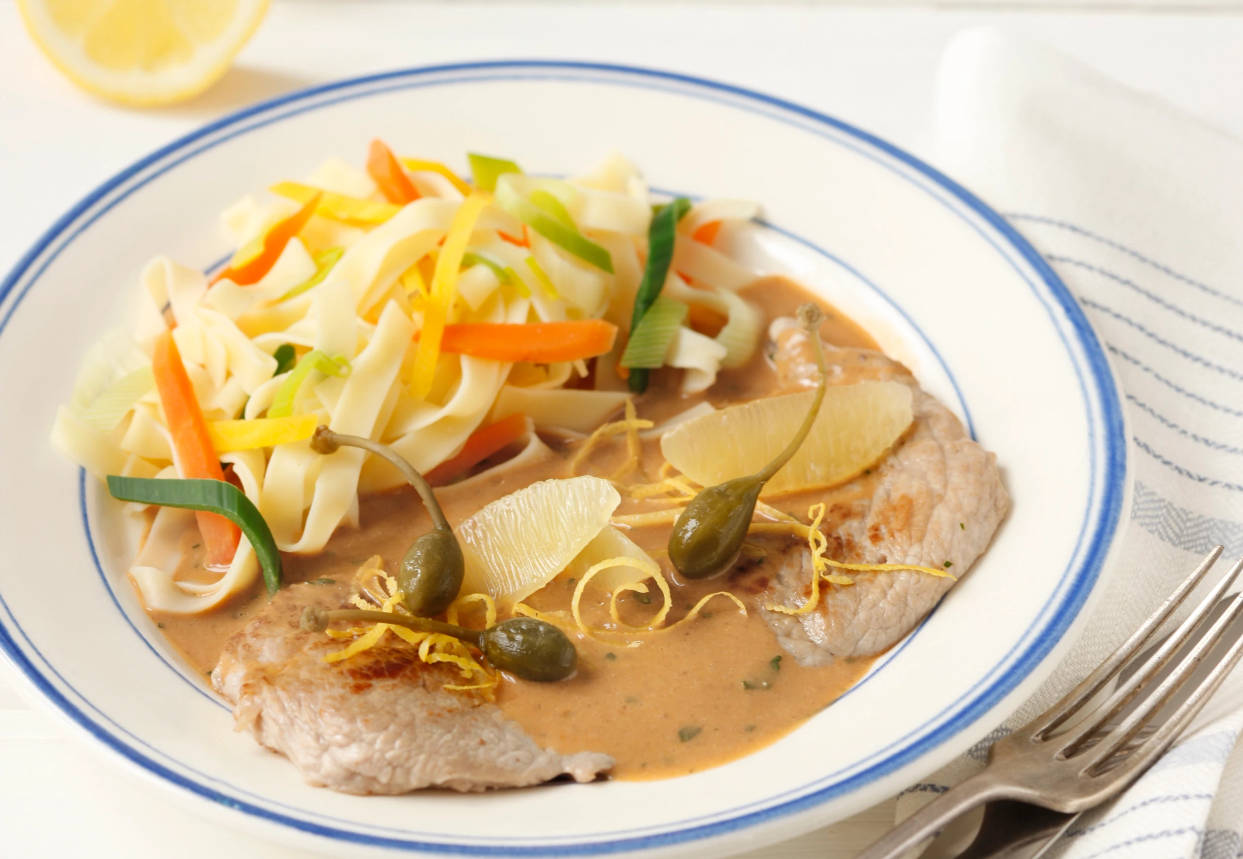 Schnitzel in der Sauce kurz erwärmen, mit der Sauce anrichten und mit Zitronenzesten, Zitronenfilets und Kapernbeeren garnieren. Als Beilage passen Gemüsenudeln.