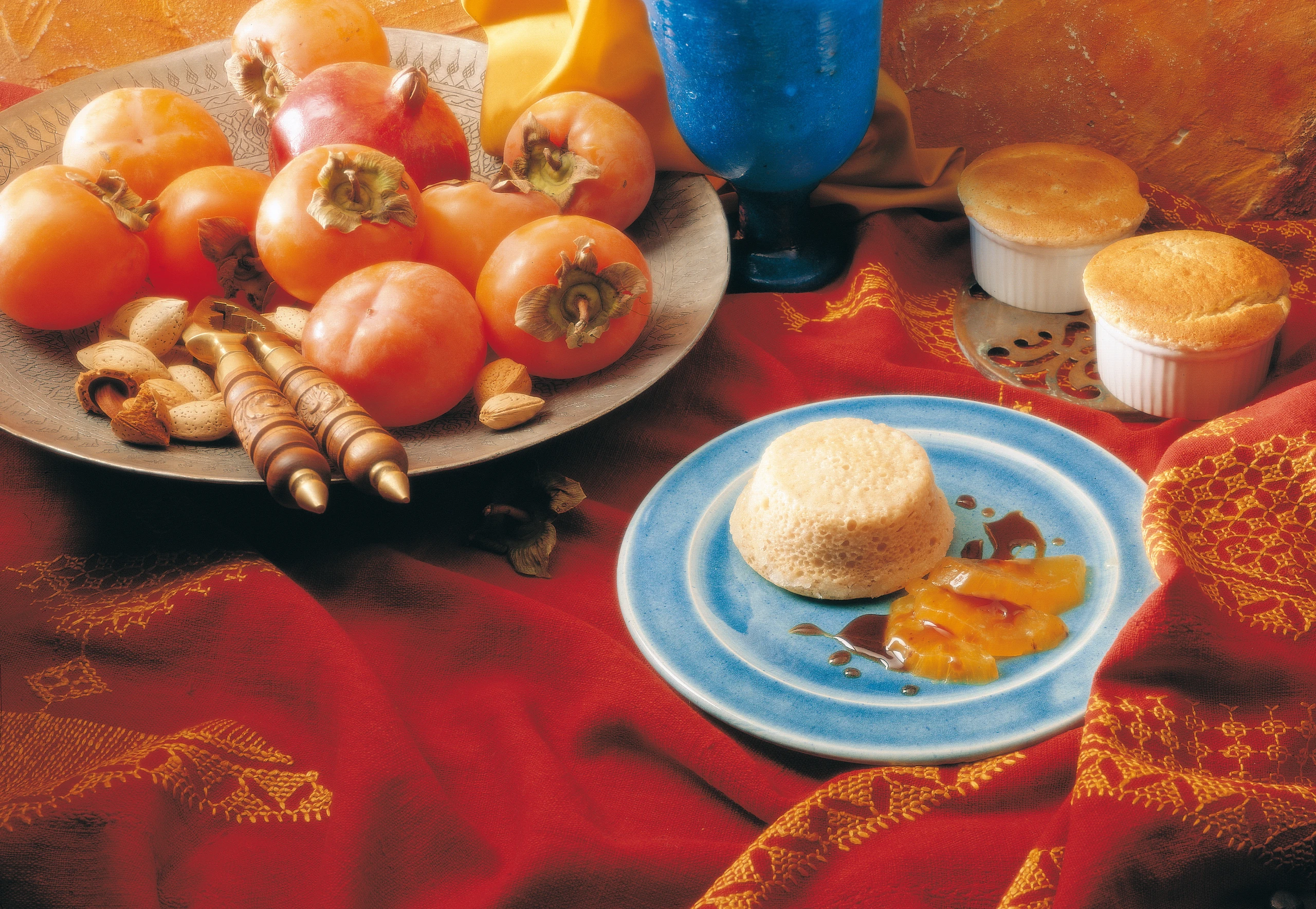 Förmchen bis ca. 1 cm unter den Rand mit der Kakimasse füllen und in eine feuerfeste Form stellen. Soviel kochendes Wasser in die Form gießen, daß die Förmchen zur Hälfte im Wasserbad stehen. Die Aufläufe im vorgeheizten Rohr (unterste Schiene / Gitterrost) ca. 20 Minuten garen.