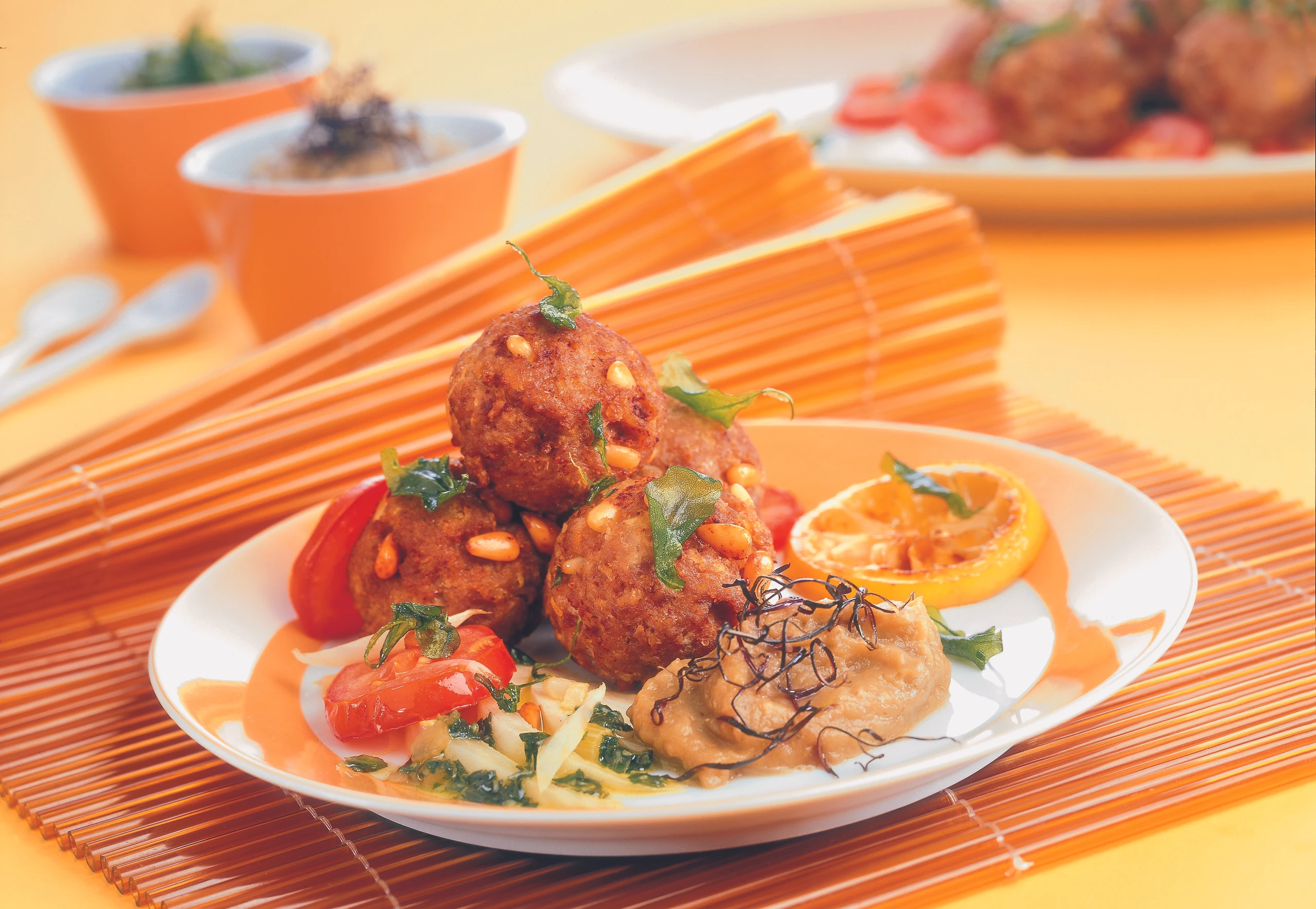 Zwiebel schälen, klein hacken und in Olivenöl glasig anschwitzen. Mit Faschiertem, Parmesan, Pinienkernen, abgeriebener Zitronenschale, Salz und Pfeffer vermischen. Mit befeuchteten Händen ca. 12 Bällchen formen.
