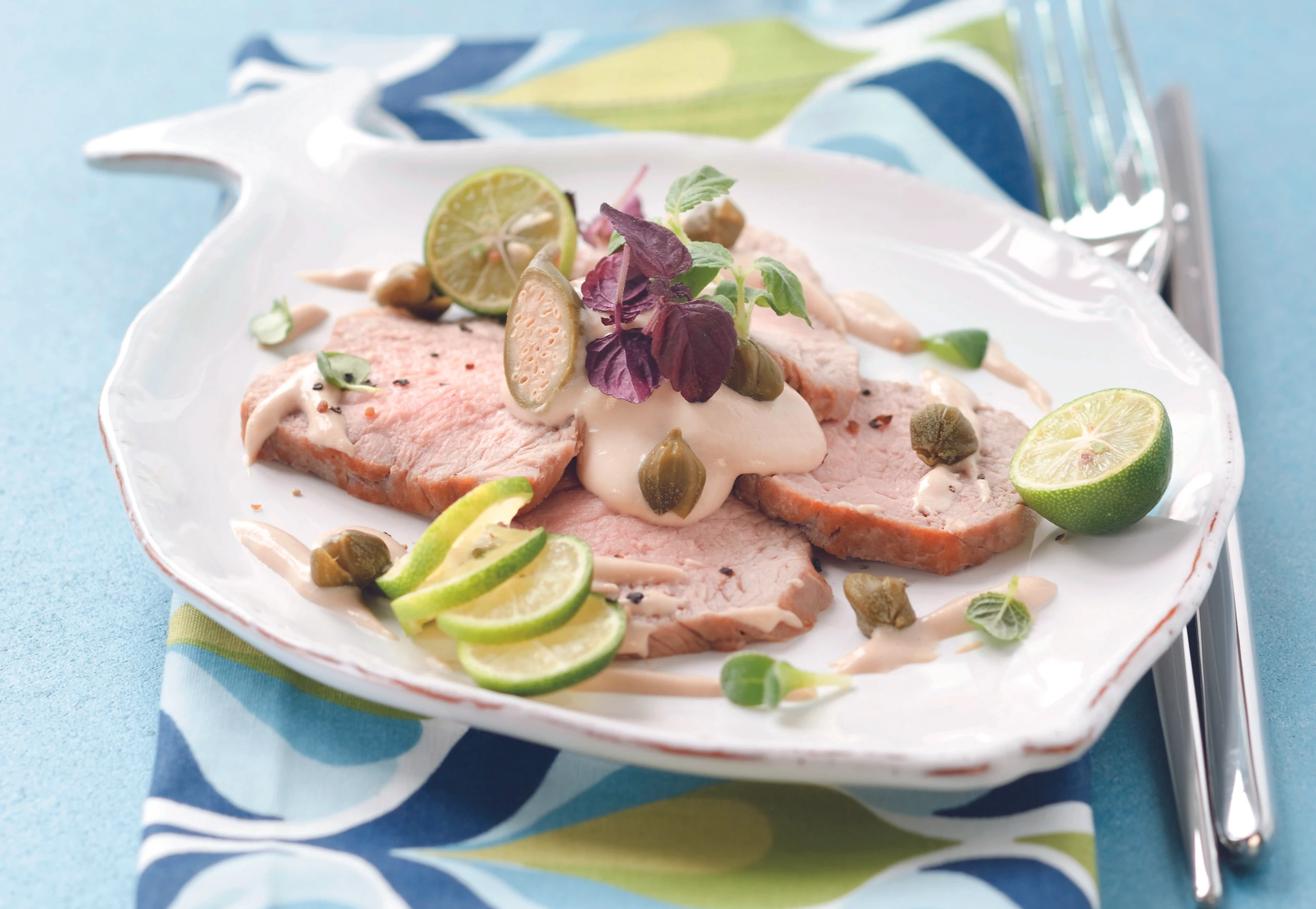 Für die Garnitur Kresseblättchen von den Stielen schneiden. Fleisch in Scheiben schneiden, mit der Sauce anrichten, mit Kapern, Limetten und Kresse garnieren.