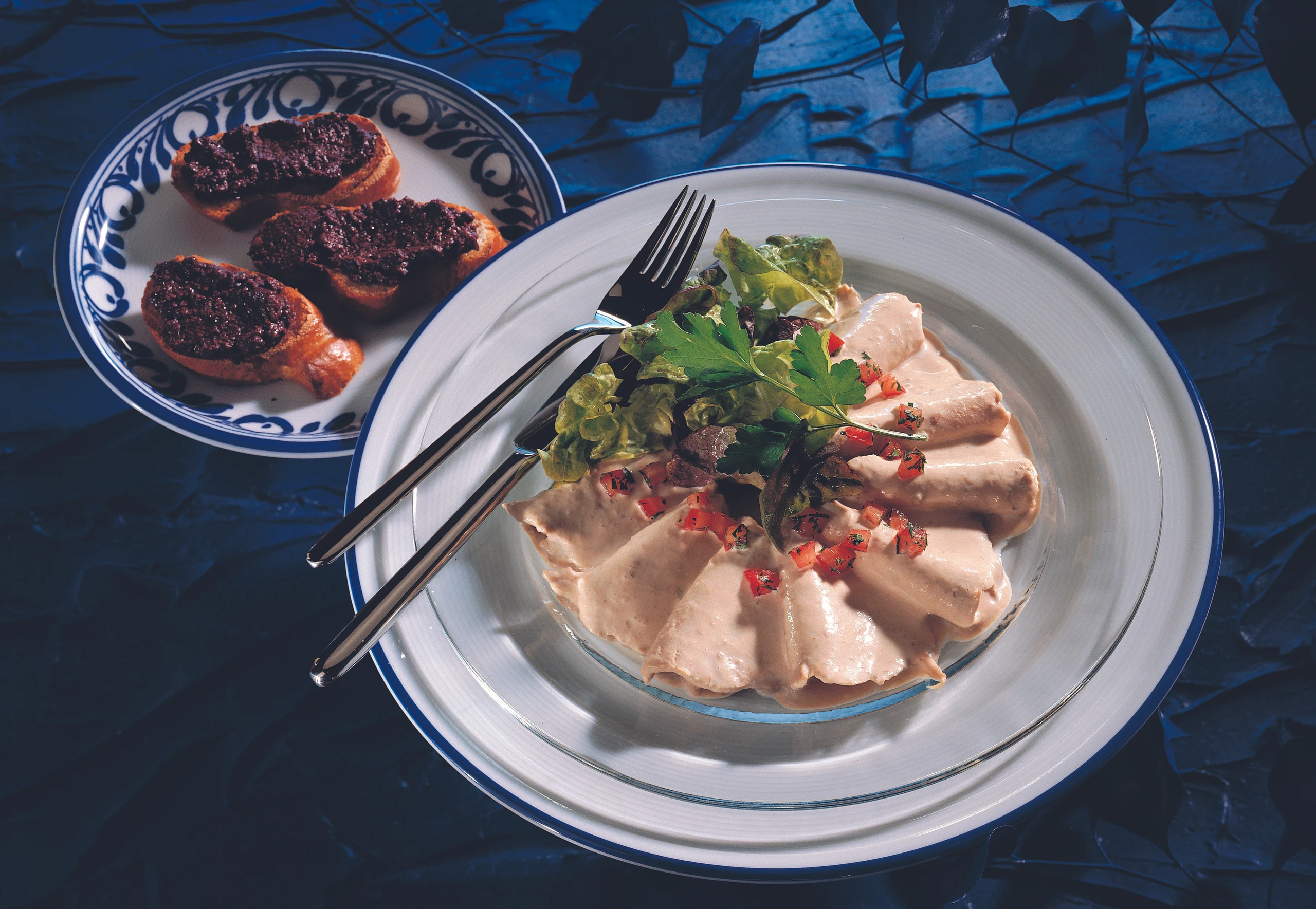 Vitello tonnato: Kalbfleisch mit Thunfischsauce und Oliven-Crostini