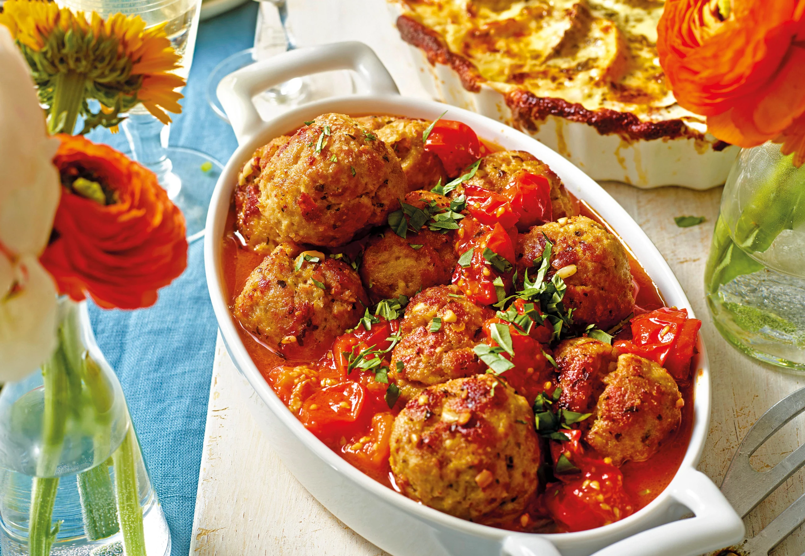 In einer beschichteten Pfanne Öl erhitzen, Bällchen darin bei mittlerer Hitze rundum goldbraun braten. Bällchen mit den Paradeisern anrichten, mit Basilikum bestreuen und mit dem Gratin servieren.