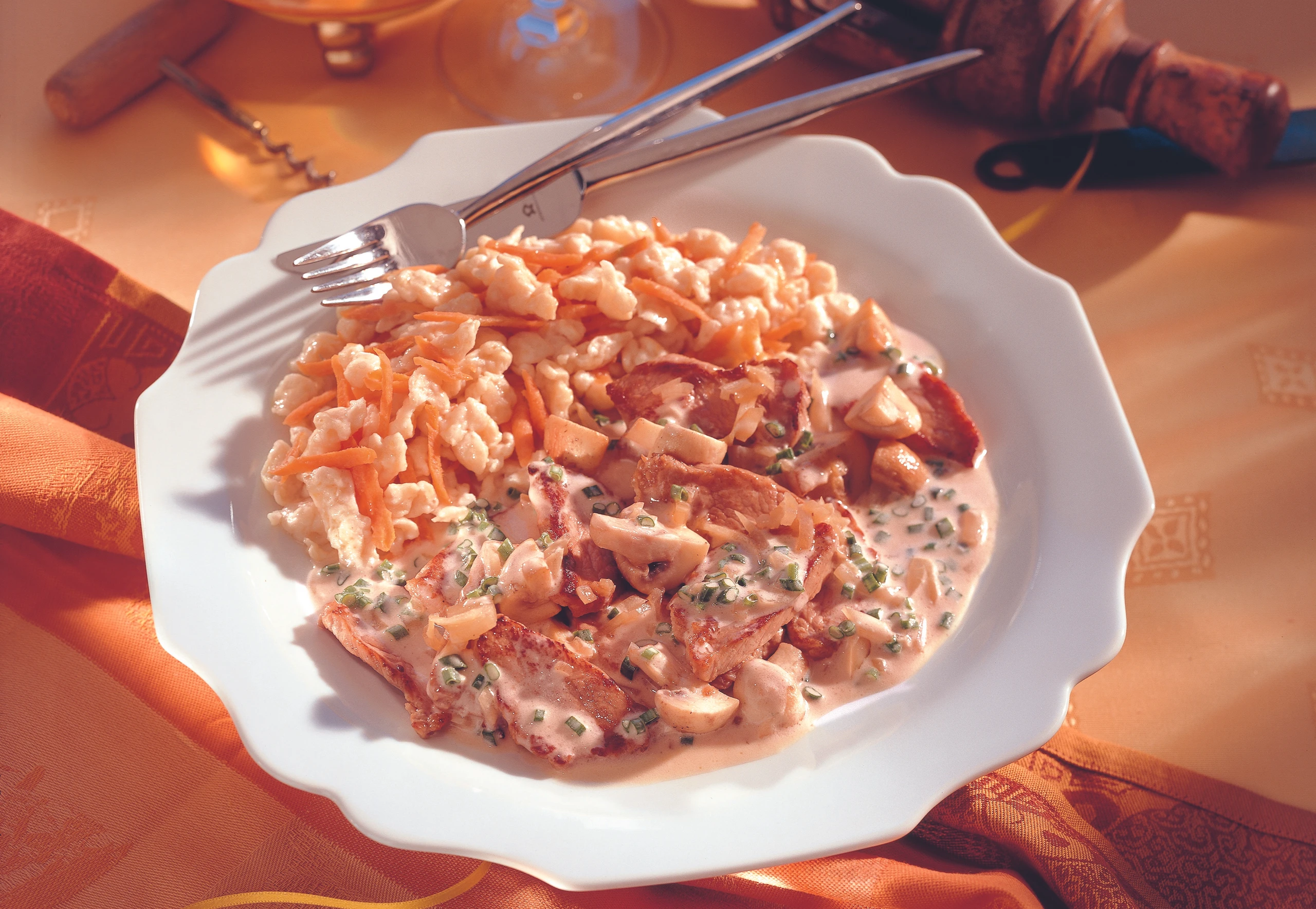 Kalbs-Geschnetzeltes mit Schwammerln und Karottenspätzle