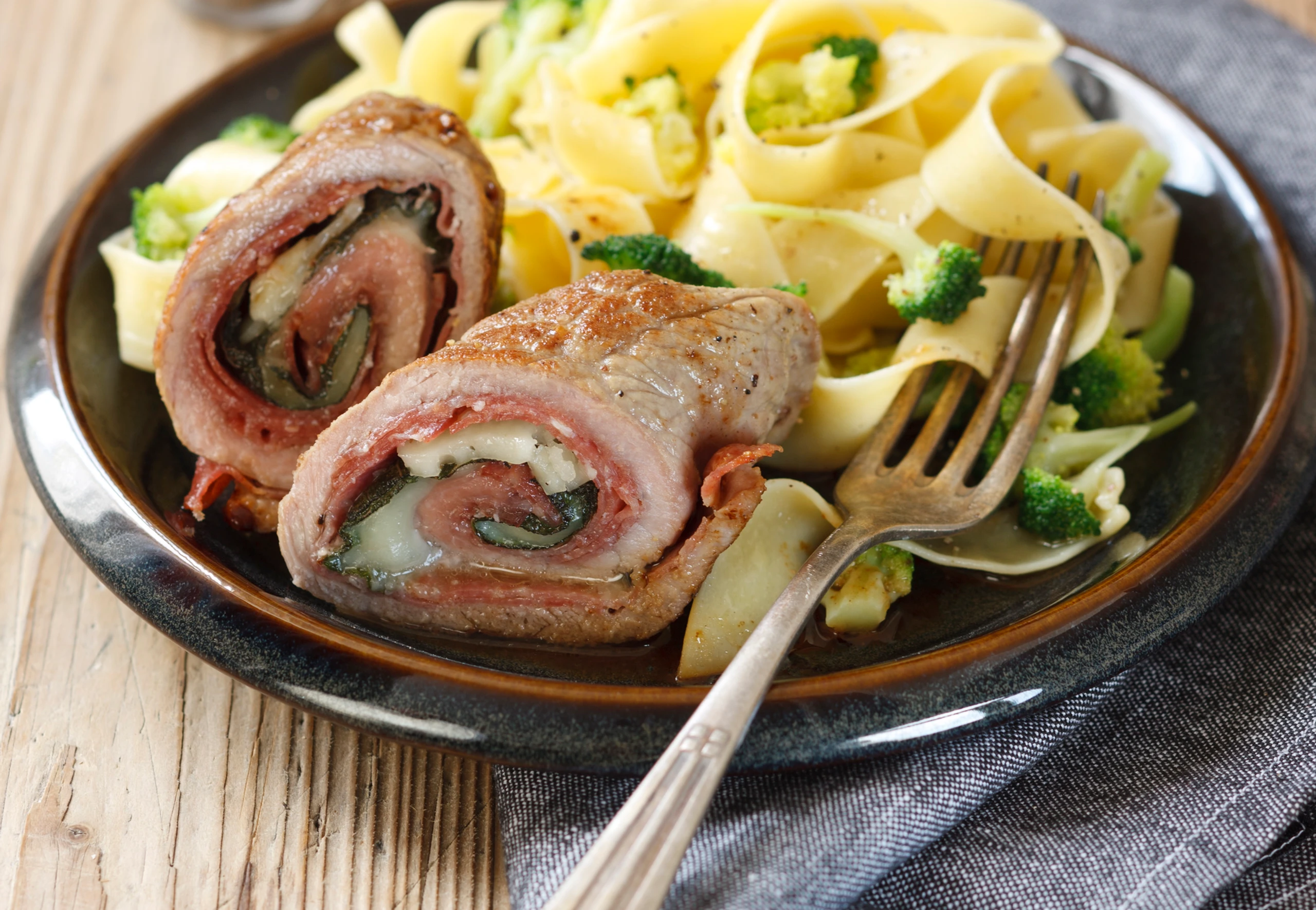 Rohr auf 160°C vorheizen. Schnitzel leicht klopfen, flach auf die Arbeitsfläche legen, mit Salz und Pfeffer würzen. Schnitzel im unteren Drittel mit Salami, Pecorino und Salbei belegen. Fleisch eng einrollen und mit Zahnstochern fixieren.