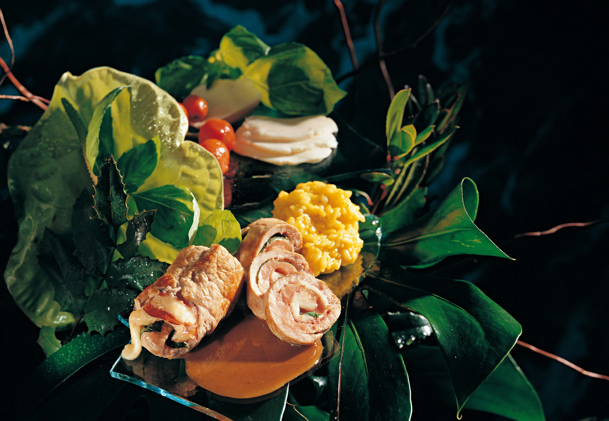 Die Schnitzel zwischen Frischhaltefolie legen und behutsam klopfen. Schnitzel salzen, pfeffern, zuerst mit Osso Collo, dann mit Mozzarellascheiben und Basilikumblättern belegen. Schnitzel straff einrollen, mit Zahnstochern fixieren und nochmals mit Salz und Pfeffer würzen. Backrohr auf ca. 90 °C vorheizen.