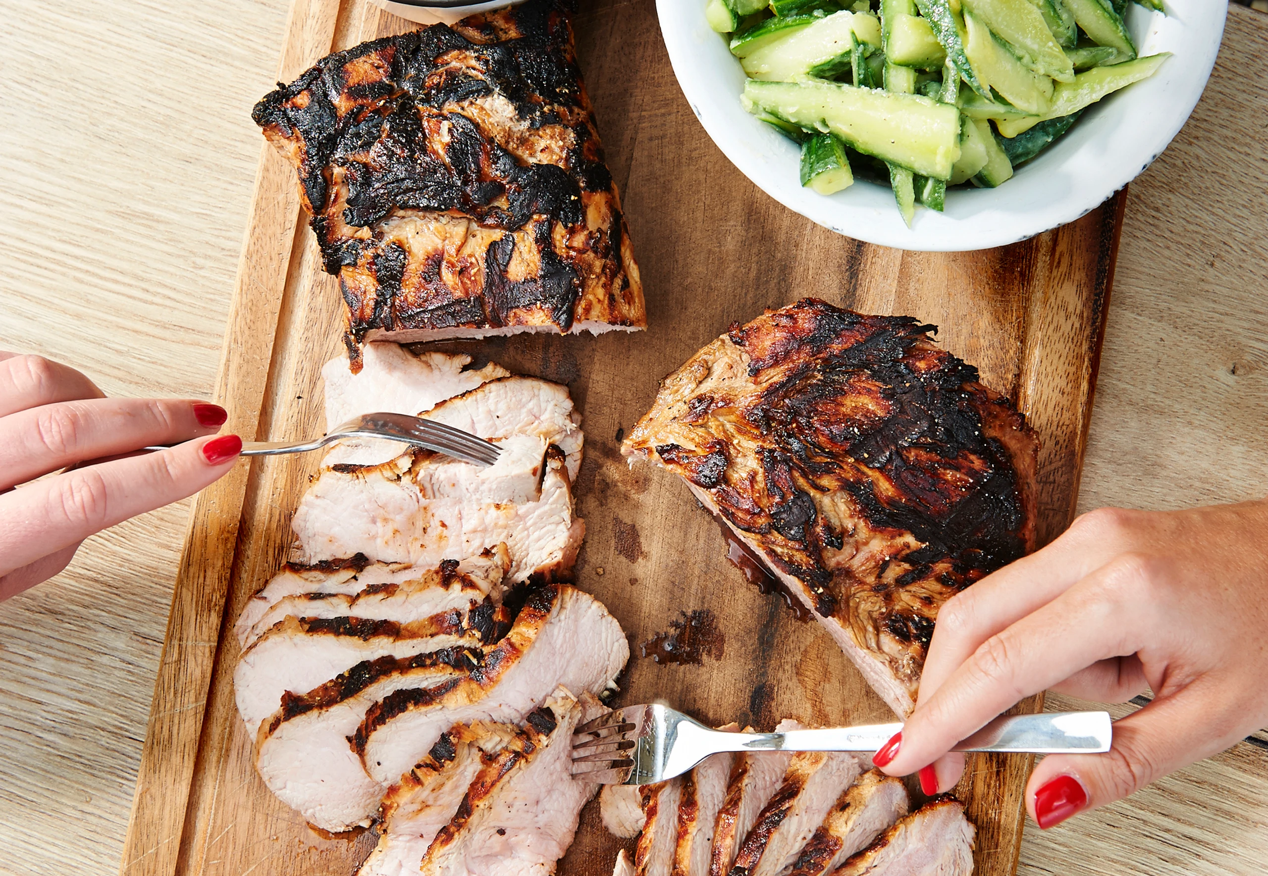 Fleisch aus der Marinade nehmen und auf Küchenpapier trockentupfen. Fleisch rundum mit Salz und Pfeffer kräftig würzen. Auf den heißen Grill legen und zugedeckt beidseitig garen (gesamt ca. 20 Minuten). Fleisch mit Sauce und Gurkengemüse anrichten.