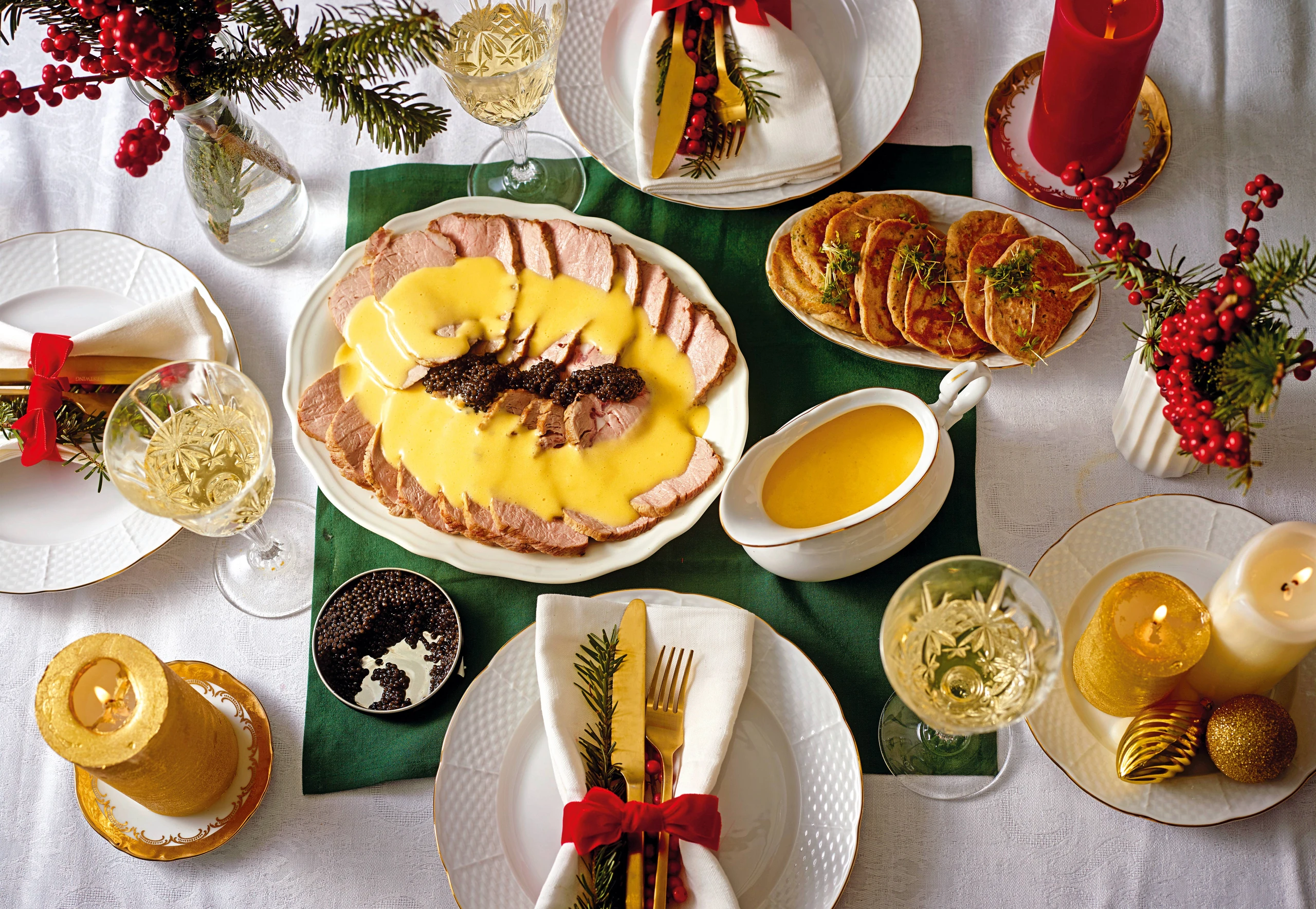 Braten in dünne Scheiben schneiden. Fleisch auf dem Saft anrichten, mit Sauce übergießen, mit Kaviar garnieren und mit den Dalken servieren. Dalken mit übriger Kresse bestreuen.