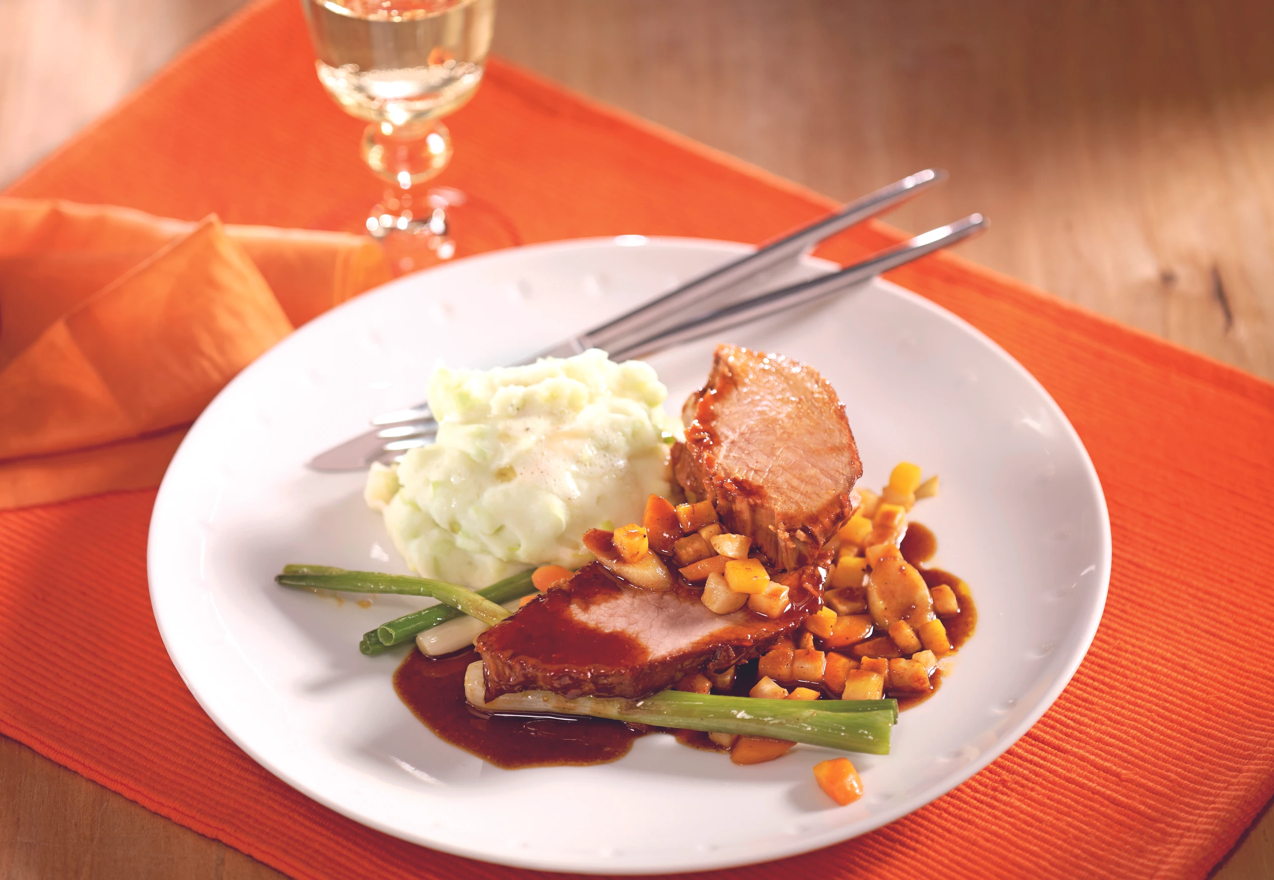 - Sauce abseihen (sollten 300 ml sein). Fleisch in Scheiben schneiden, mit Sauce und Beilagen anrichten.
