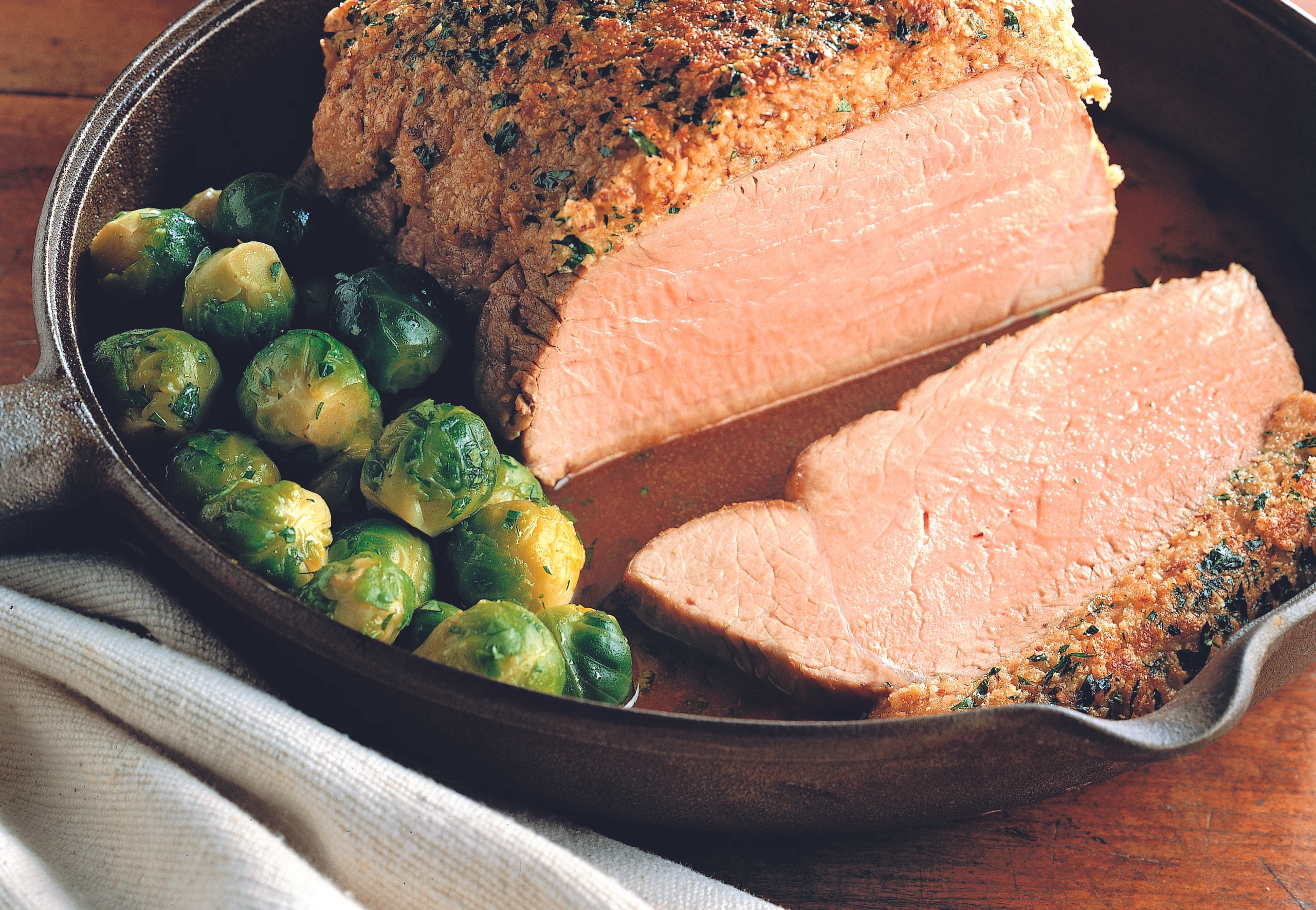 Braten aus der Pfanne heben und warmstellen. Bratensaft durch ein feines Sieb gießen und eventuell mit wenig gehackten Kräutern verfeinern. Fleisch in Scheiben schneiden und mit dem Bratensaft anrichten.