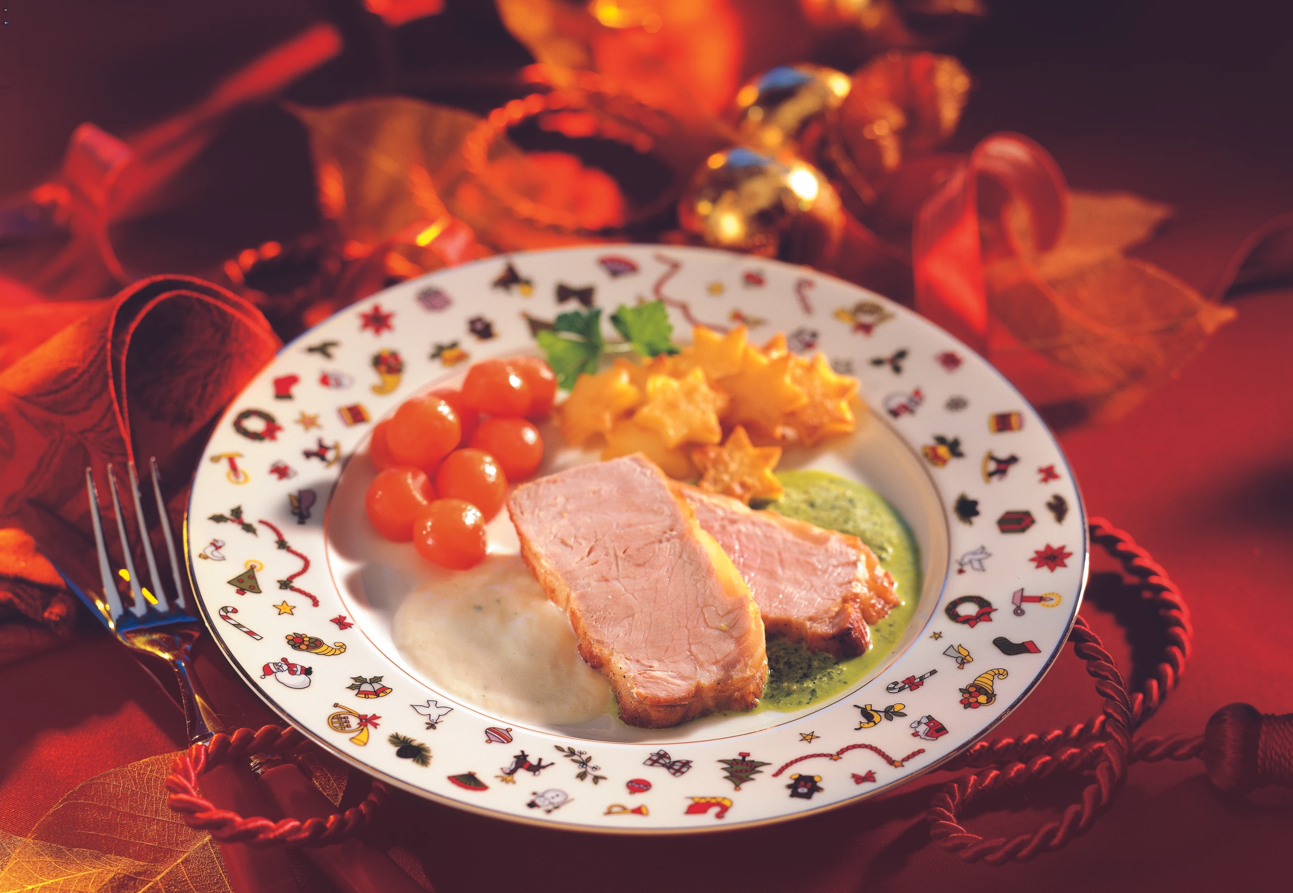Bratensaft abseihen und abmessen – sollte ca. 120 ml sein (falls nötig noch etwas einkochen oder mit Wasser auffüllen). Saft aufkochen, grünes Petersilpüree einrühren, kurz erwärmen und mit einem Stabmixer aufschlagen. Fleisch in Scheiben schneiden, mit den Saucen und den Beilagen anrichten.