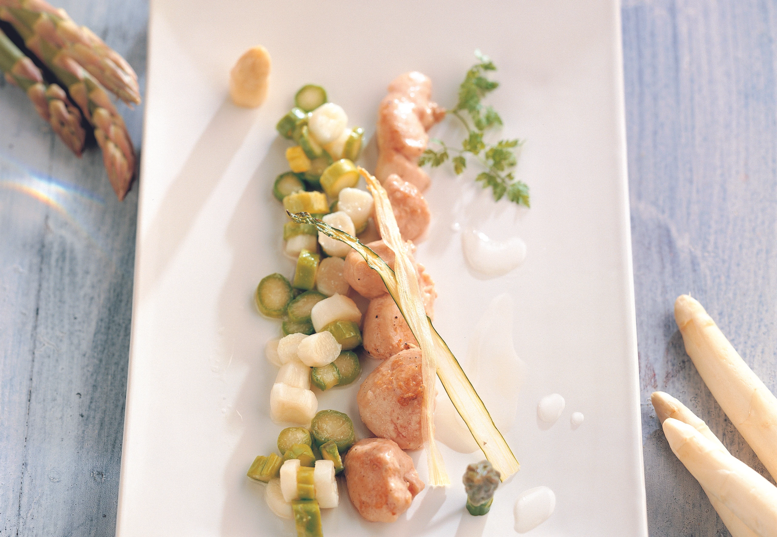 Weißen Spargel unter dem Kopf beginnend, grünen im unteren Drittel schälen, trockene Enden wegschneiden. Spargel getrennt in Salzwasser bissfest kochen. Abseihen, abschrecken und abtropfen lassen. Spitzen ca. 3 cm lang abschneiden, übrigen Spargel in 1 cm dicke Scheiben schneiden.