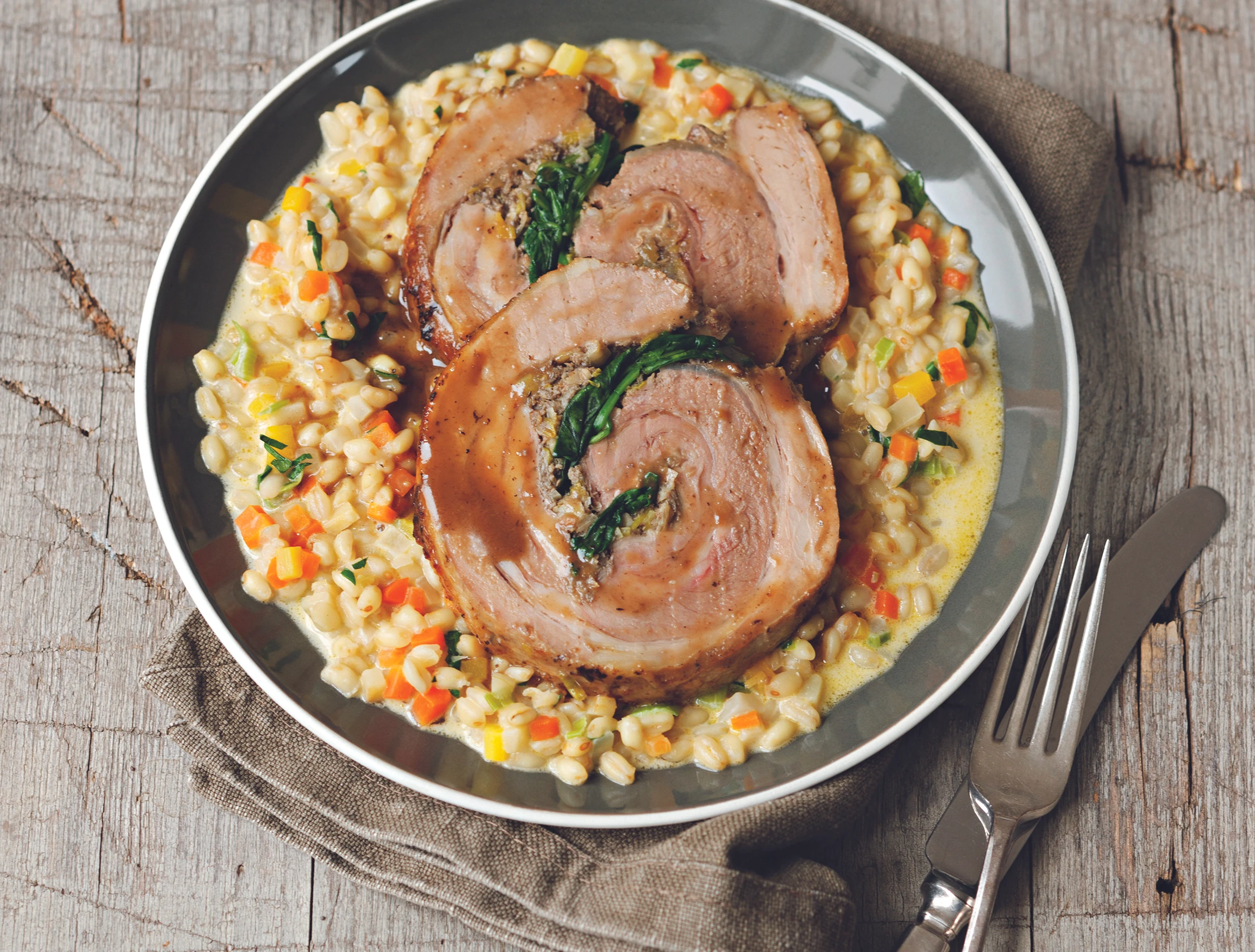 Rohr auf 160°C vorheizen. Kalbsbrust salzen, pfeffern und zu zwei Dritteln mit Spinat belegen. Schwammerl-Mischung auf dem Spinat verstreichen. Fleisch über die Fülle eng einrollen, mit Spagat binden und mit Salz und Pfeffer würzen.