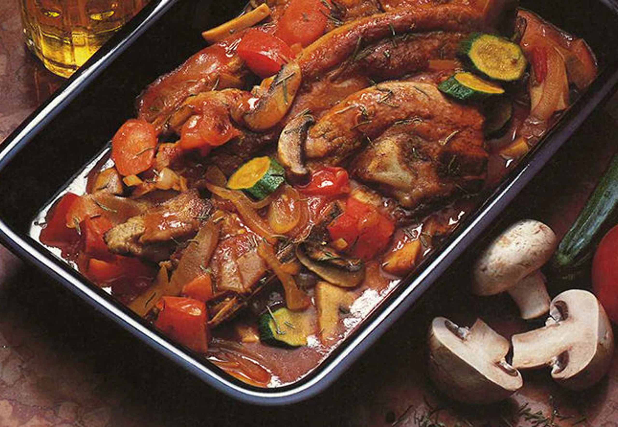 Zucchini, Champignons und Paradeiser erst beifügen, wenn das Fleisch nicht mehr allzu lange braucht, um gar zu sein. Pikant abschmecken und sehr heiß servieren. Dazu reicht man Risipisi oder Safranreis.