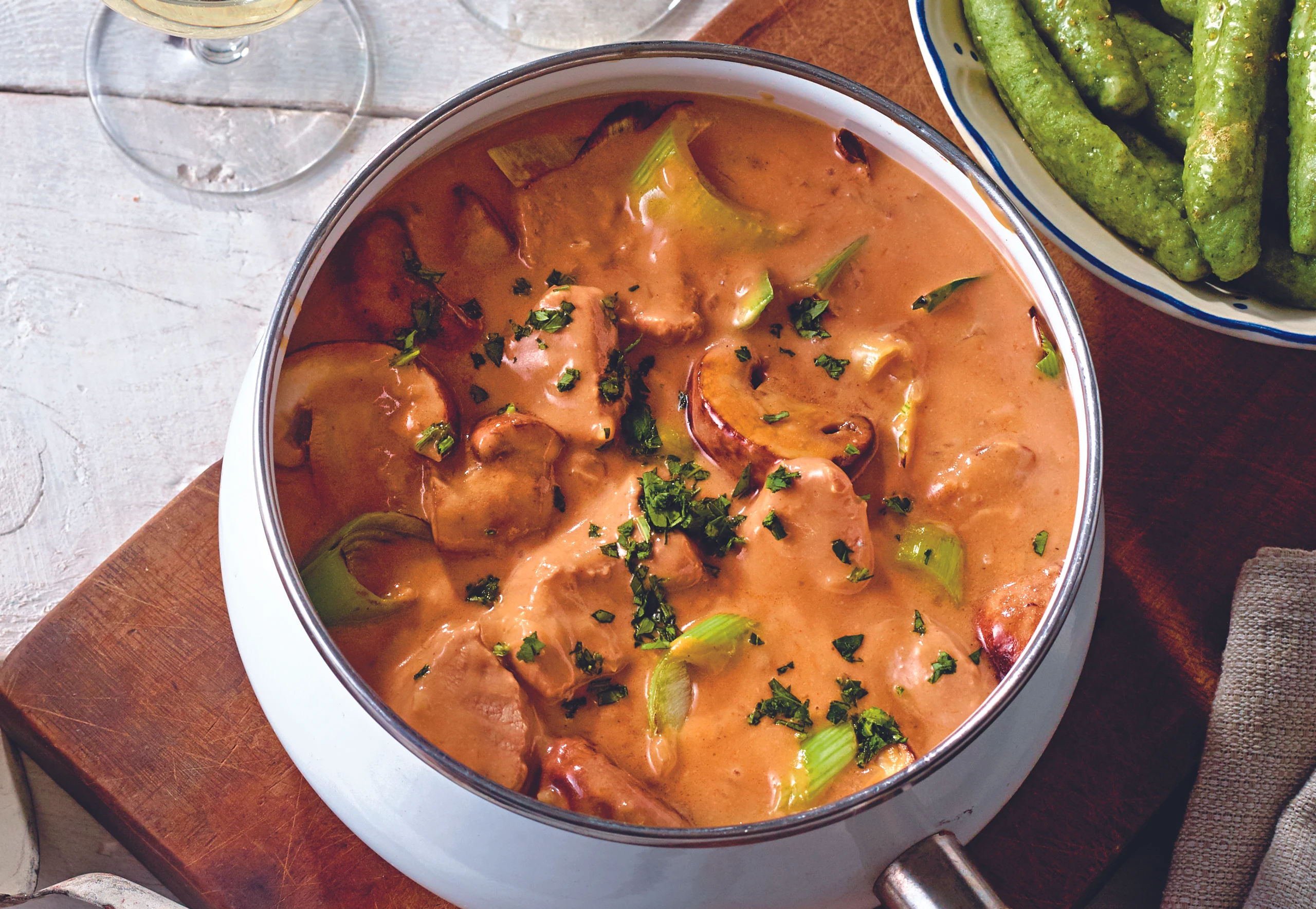 Fleisch aus der Sauce heben und beiseite stellen. Stärke mit Wasser vermischen. Obers und Stärke in die Sauce rühren und ca. 4 Minuten köcheln. Parallel dazu Champignons und Lauch im übrigen Öl anbraten und mit Salz und Pfeffer würzen.