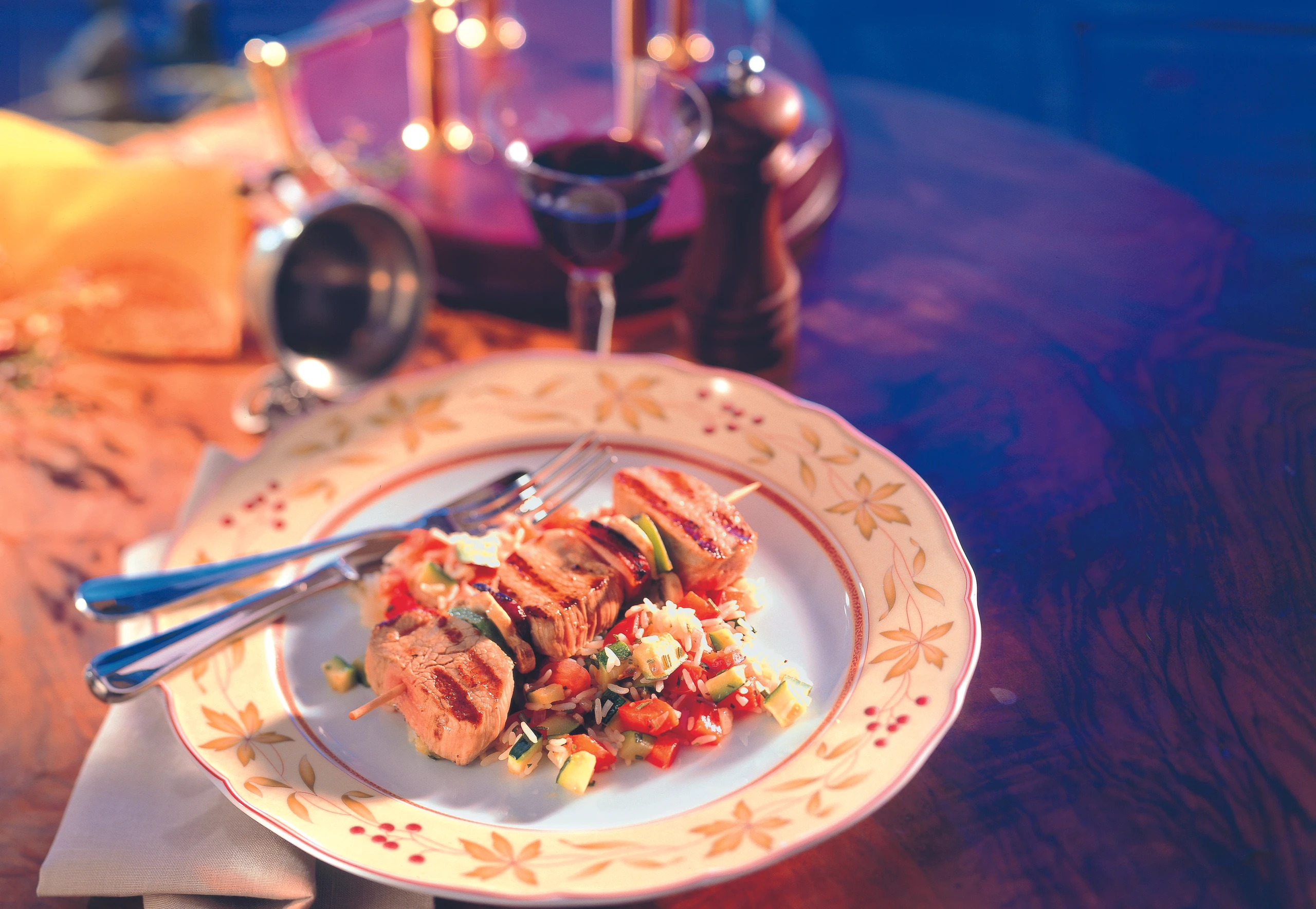 - Grillpfanne erhitzen und die Spieße beidseitig grillen (dauert insgesamt ca. 8 Minuten). Spieße mit dem Reis anrichten.