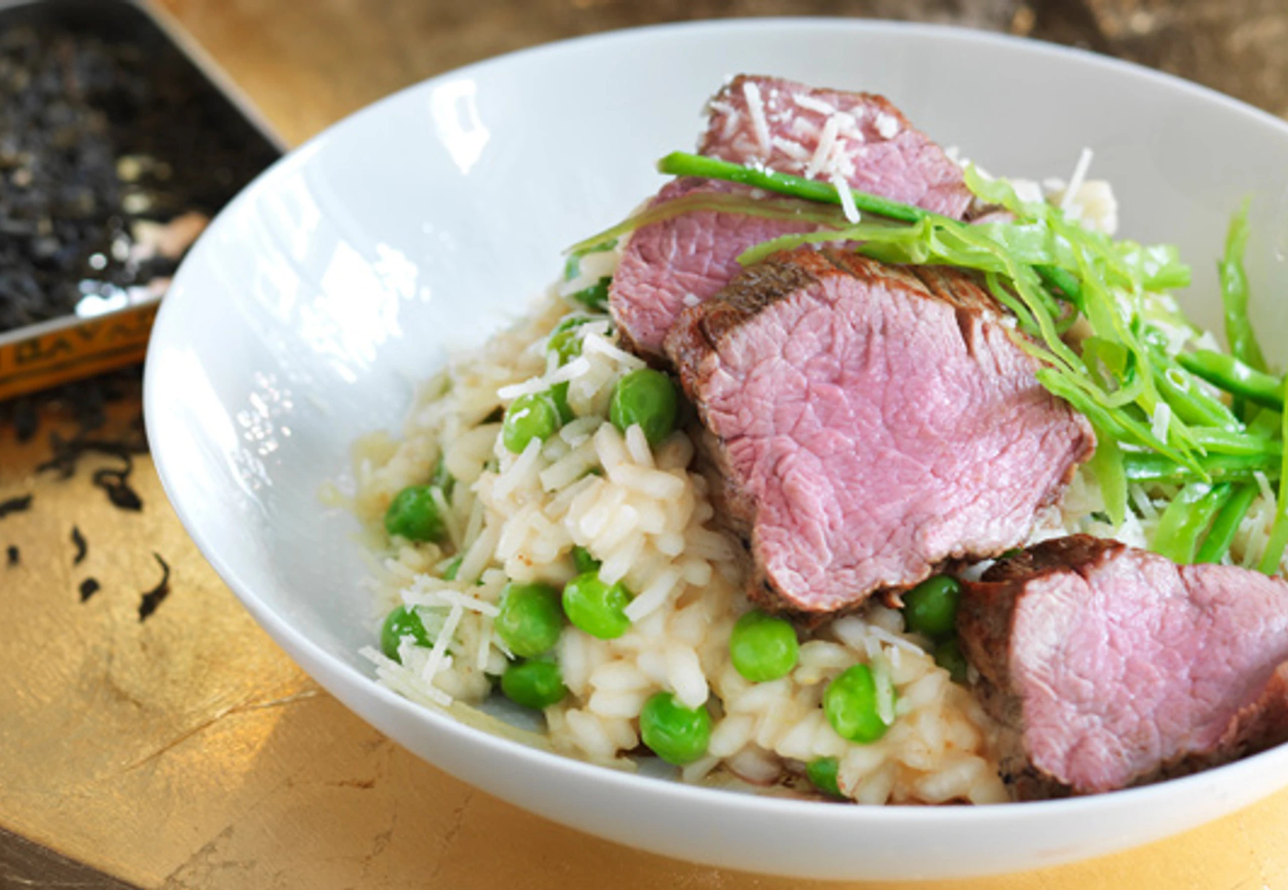 Kalbsfilet in Tee geräuchert mit Erbsenrisotto