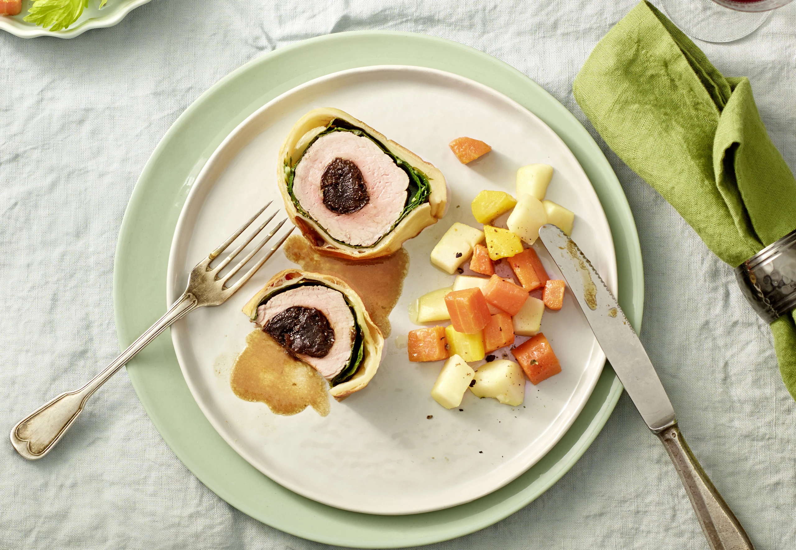 Zwetschken abtropfen lassen. In das dickere Ende jedes Filets eine ca. 2 cm breite Öffnung schneiden und mit einem Kochlöffelstiel bis knapp an das Ende des Fleischstückes verlängern. Zwetschken in die Öffnungen füllen und mit dem Kochlöffelstiel nachdrücken. Fleisch salzen, pfeffern, in 4 EL Öl rundum anbraten, herausnehmen und auskühlen lassen.