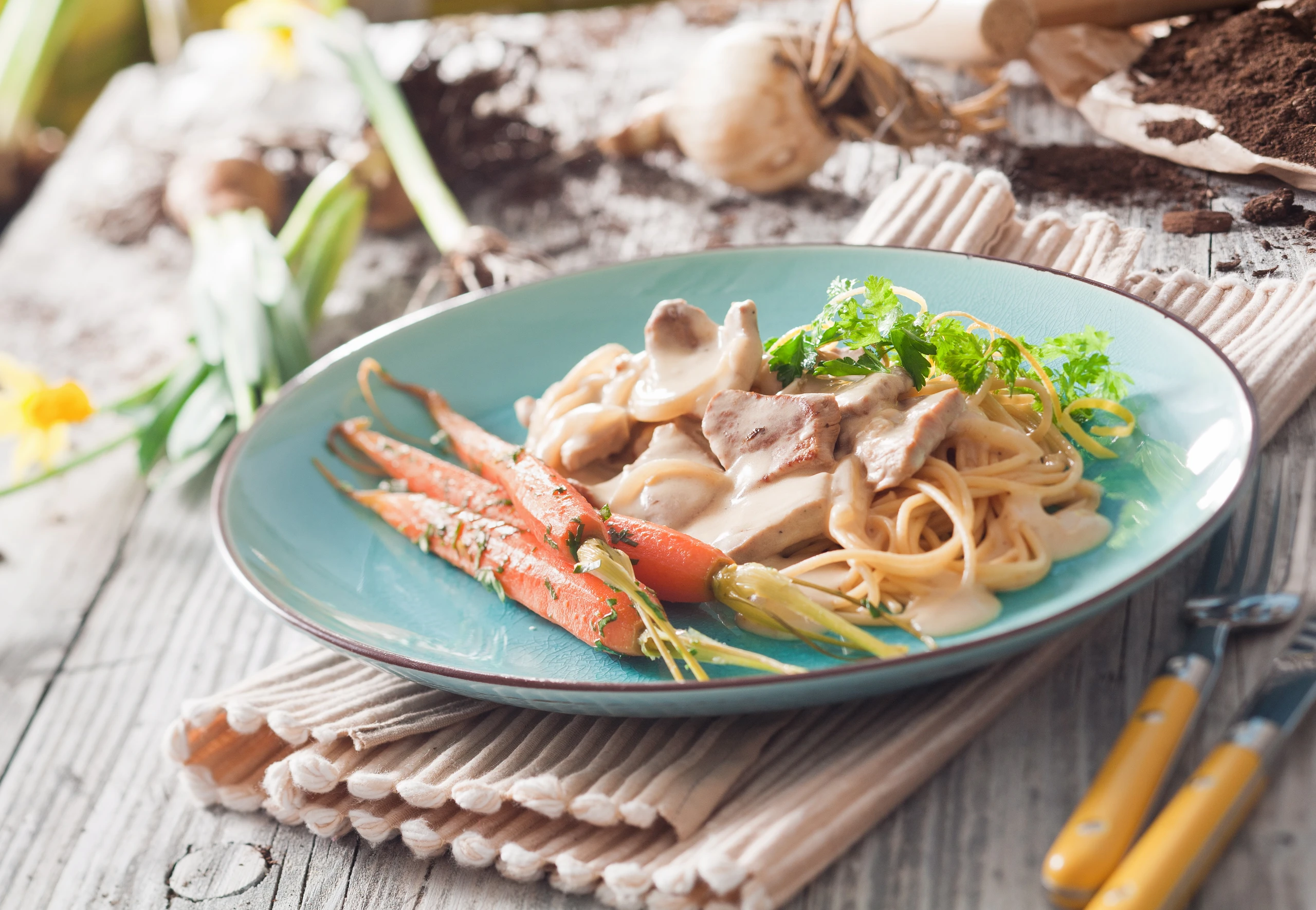Kalbsgeschnetzeltes auf Spaghetti mit Petersil-Karotten