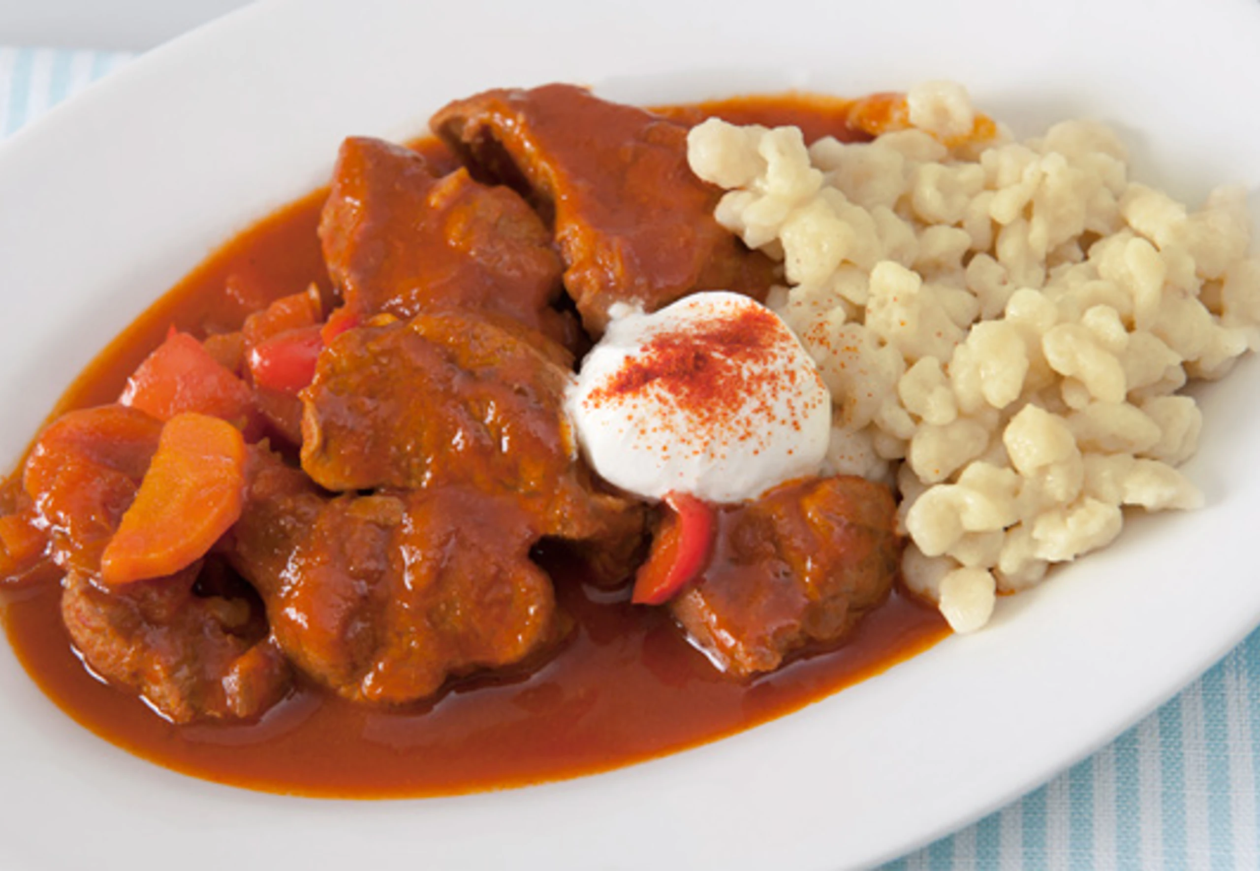 - Gulasch mit den Nockerln anrichten, mit Sauerrahm und Paprika garnieren.