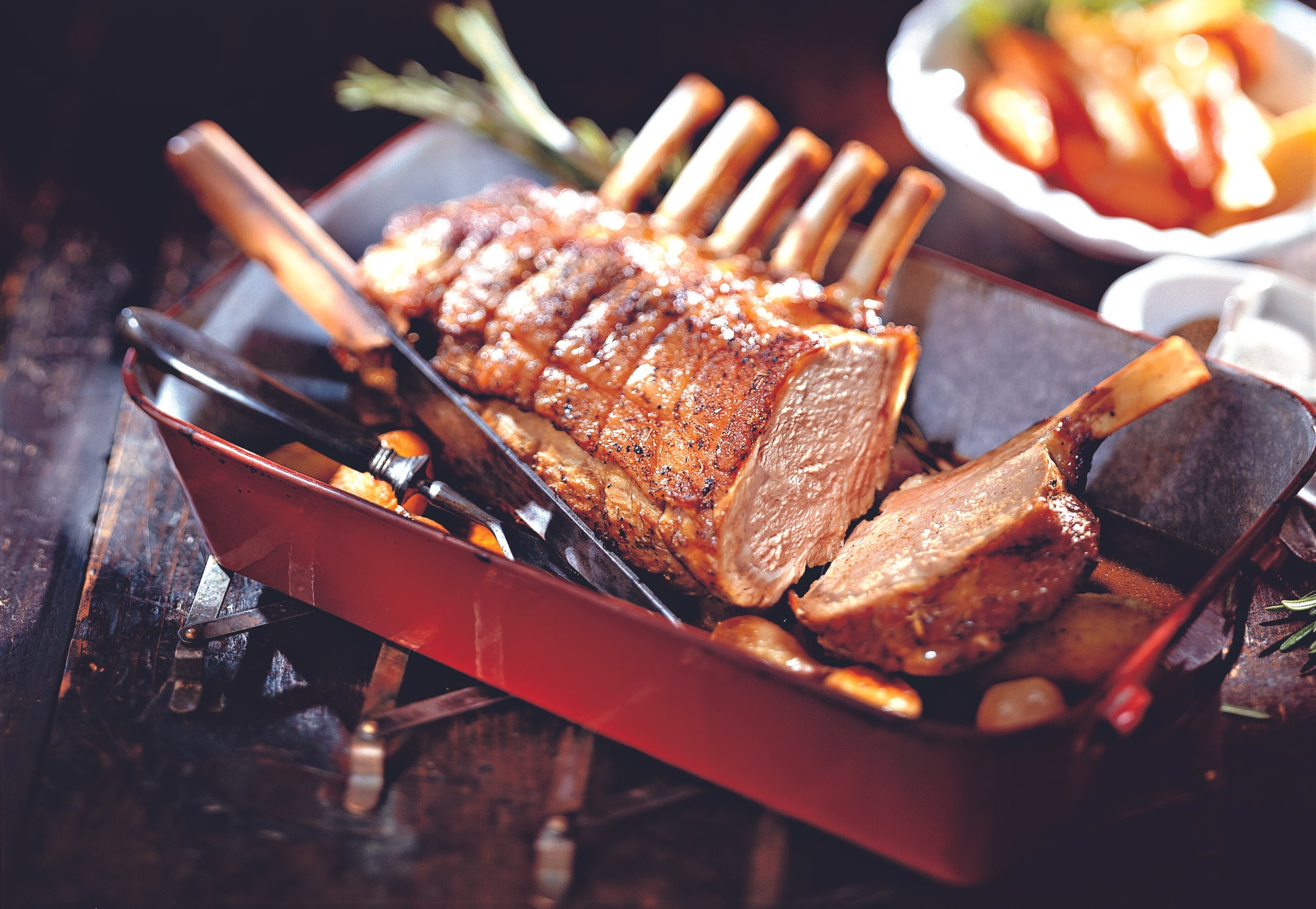 Rohr auf 160°C vorheizen. In einem Bräter Öl erhitzen, Fleisch und Knochen darin rundum anbraten. Gemüsescheiben, Zwiebeln und restlichen Rosmarin zugeben. Bräter zudecken und ins Rohr schieben (unteres Drittel / Gitterrost). Fleisch während des Bratens immer wieder mit etwas vom Wein und der Suppe untergießen und mit dem entstehenden Saft beträufeln. Fleisch ca. 70 Minuten braten – nach ca. 20 Minuten Erdäpfel zugeben.