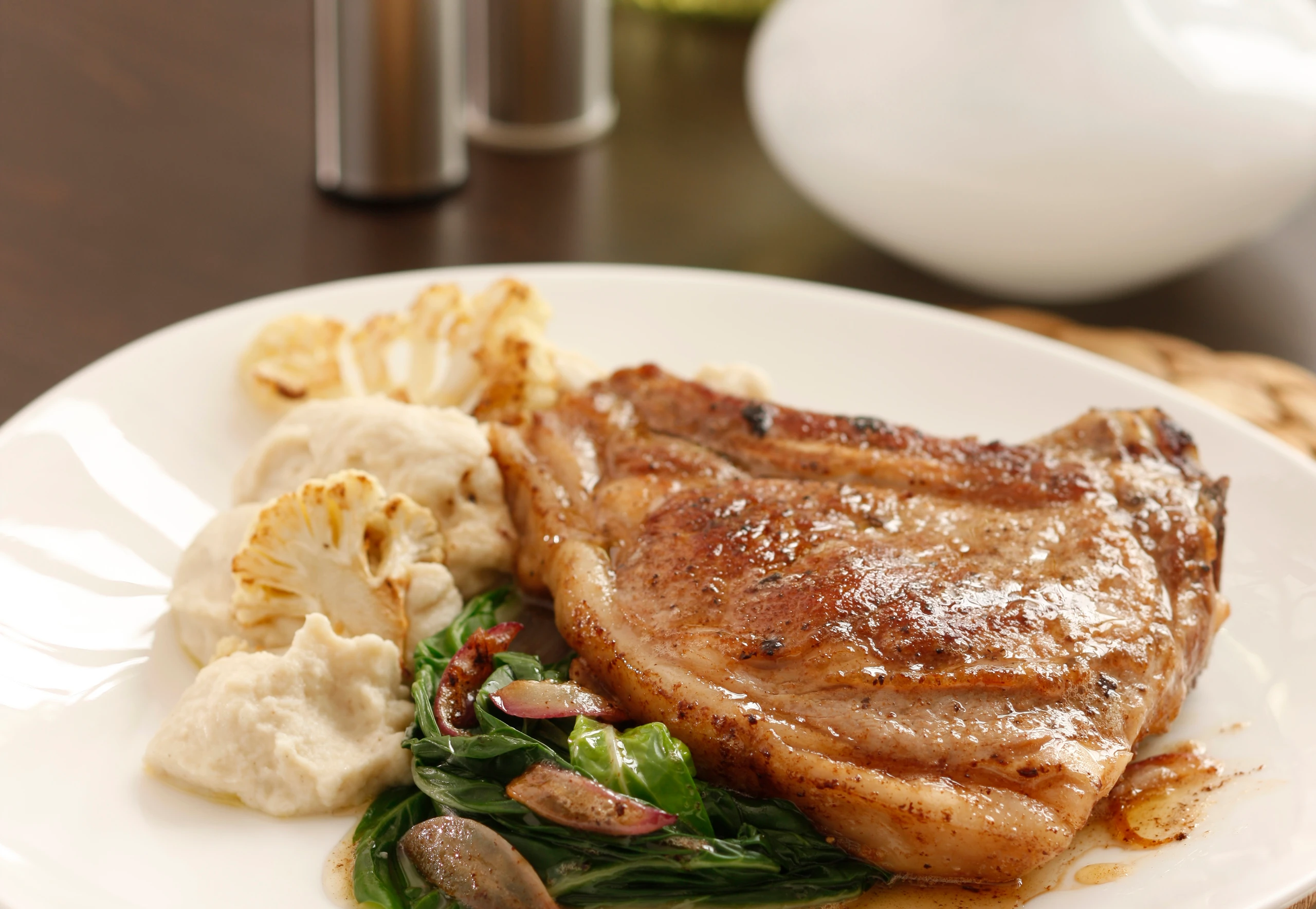 Koteletts salzen, pfeffern und in 3 EL Öl beidseitig braten, gegen Ende der Garzeit 1 TL Butter zugeben. Fleisch fertig braten; dabei mit Bratfett übergießen. Koteletts mit Mangold und Karfiolpüree anrichten, Püree mit gebratenem Karfiol garnieren. Koteletts eventuell mit Bratfett beträufeln.