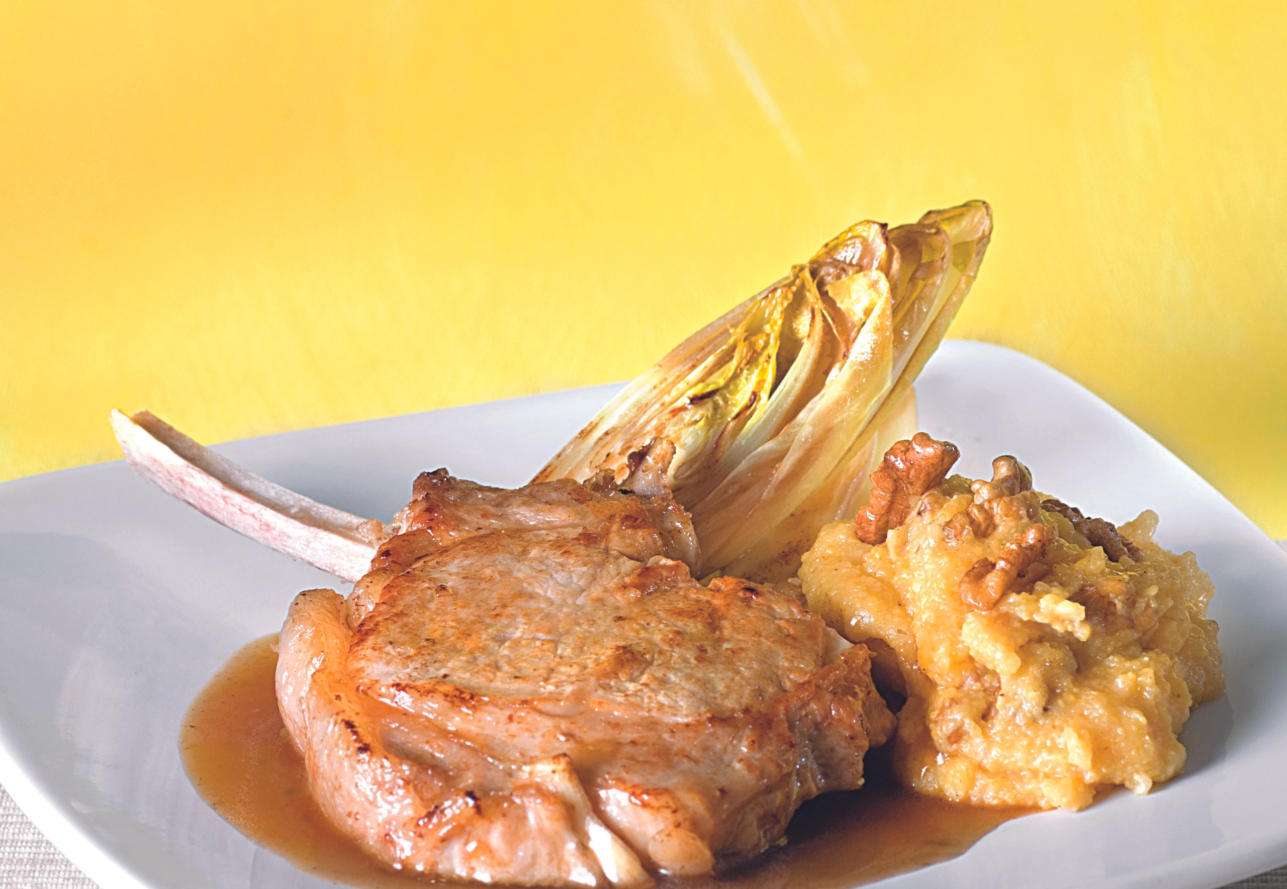Bratrückstand mit Marsala ablöschen, Fond oder Suppe zugießen und aufkochen. Stärke mit 2 TL Wasser anrühren, in die Sauce rühren. Sauce aufkochen, abschmecken, Koteletts darin erwärmen, aber nicht aufkochen. Koteletts auf dem Chicoree anrichten, mit Sauce und Polenta servieren.