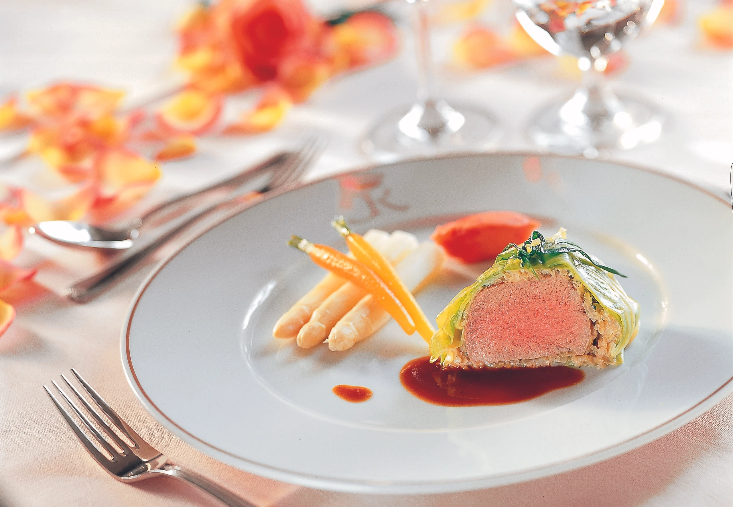 Kalbsmedaillons mit Krauthülle, Spargel und Paradeis-Erdäpfelpüree