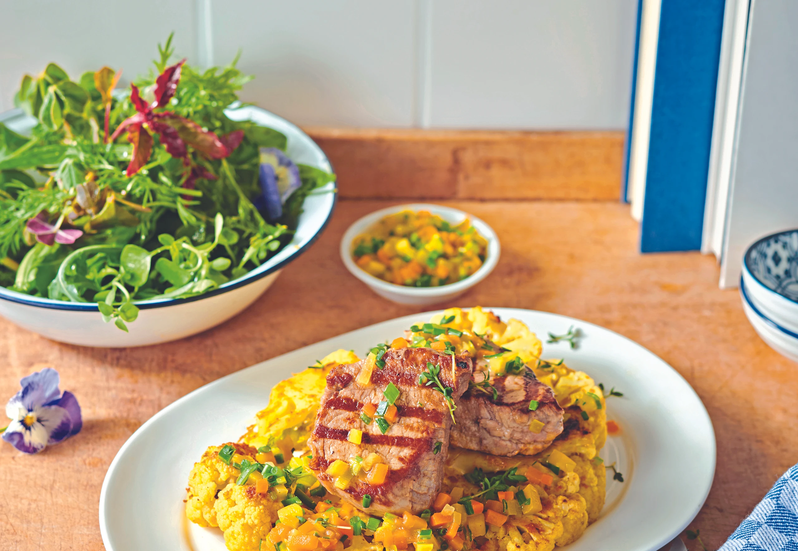 Kalbsmedaillons mit Karfiol, Gemüsesalsa und Kräutersalat