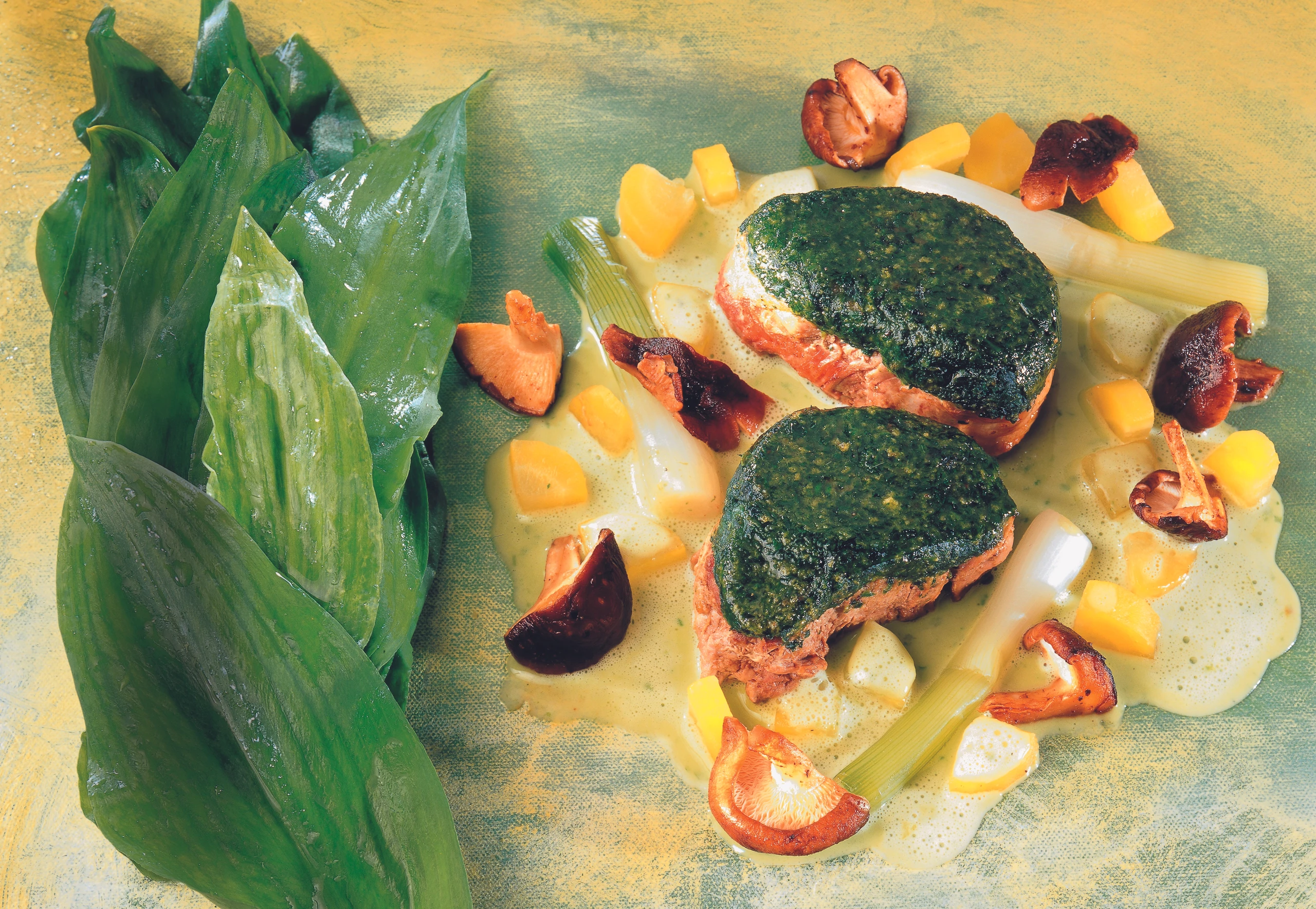Kalbsmedaillons mit Bärlauchkruste auf Gemüseragout
