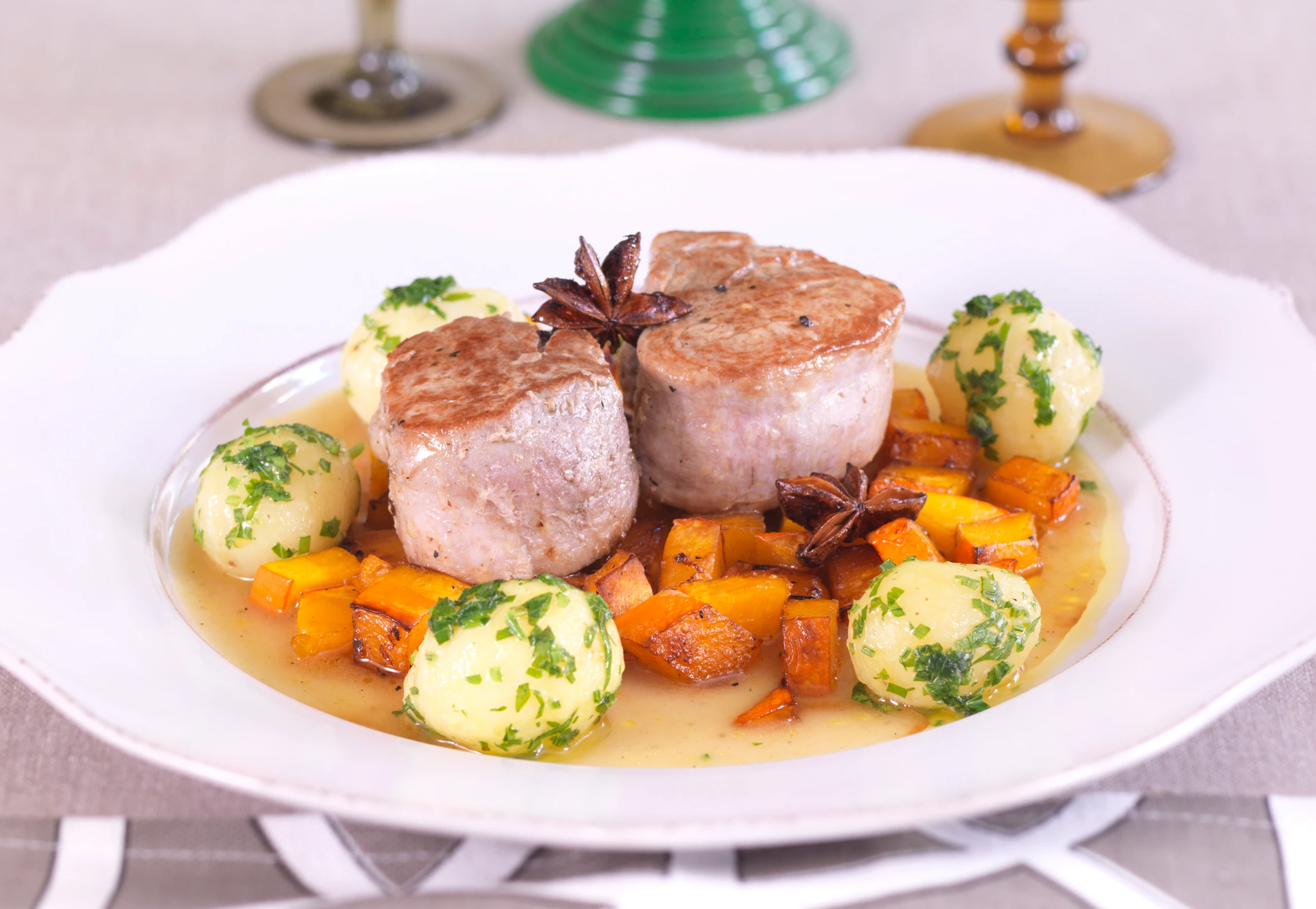 - Rohr auf 80°C vorheizen. Medaillons salzen, pfeffern und in 3 EL Öl beidseitig braten. Aus der Pfanne nehmen und warm stellen. Bratrückstand mit Suppe ablöschen und ein wenig einkochen. Erdäpfel in der Butter schwenken, Petersilie untermischen. Medaillons mit Kürbis und Erdäpfeln anrichten und mit Bratensaft beträufelt servieren.
