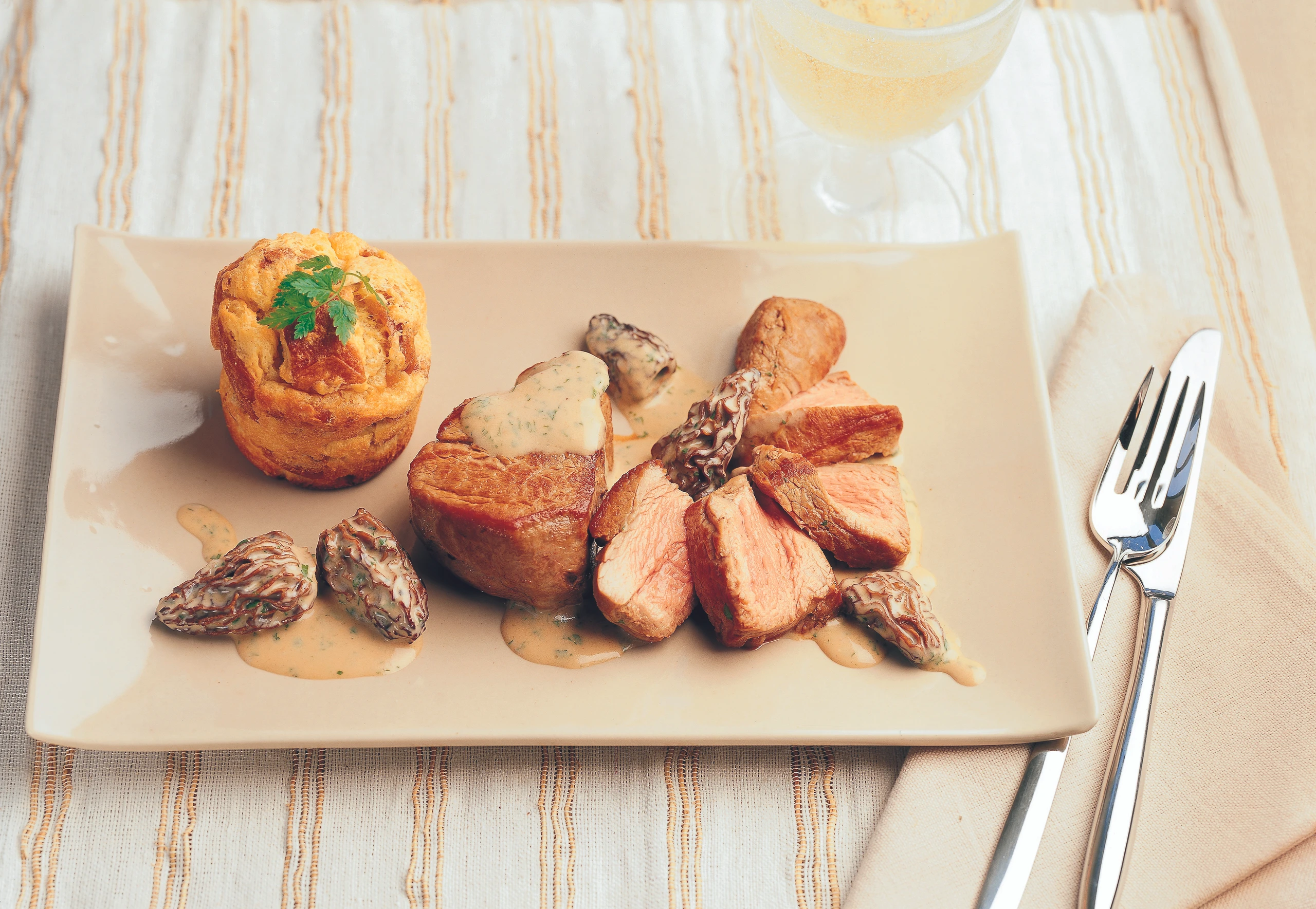 Kalbsmedaillons mit Morchelsauce und pikanten Briocheaufläufen