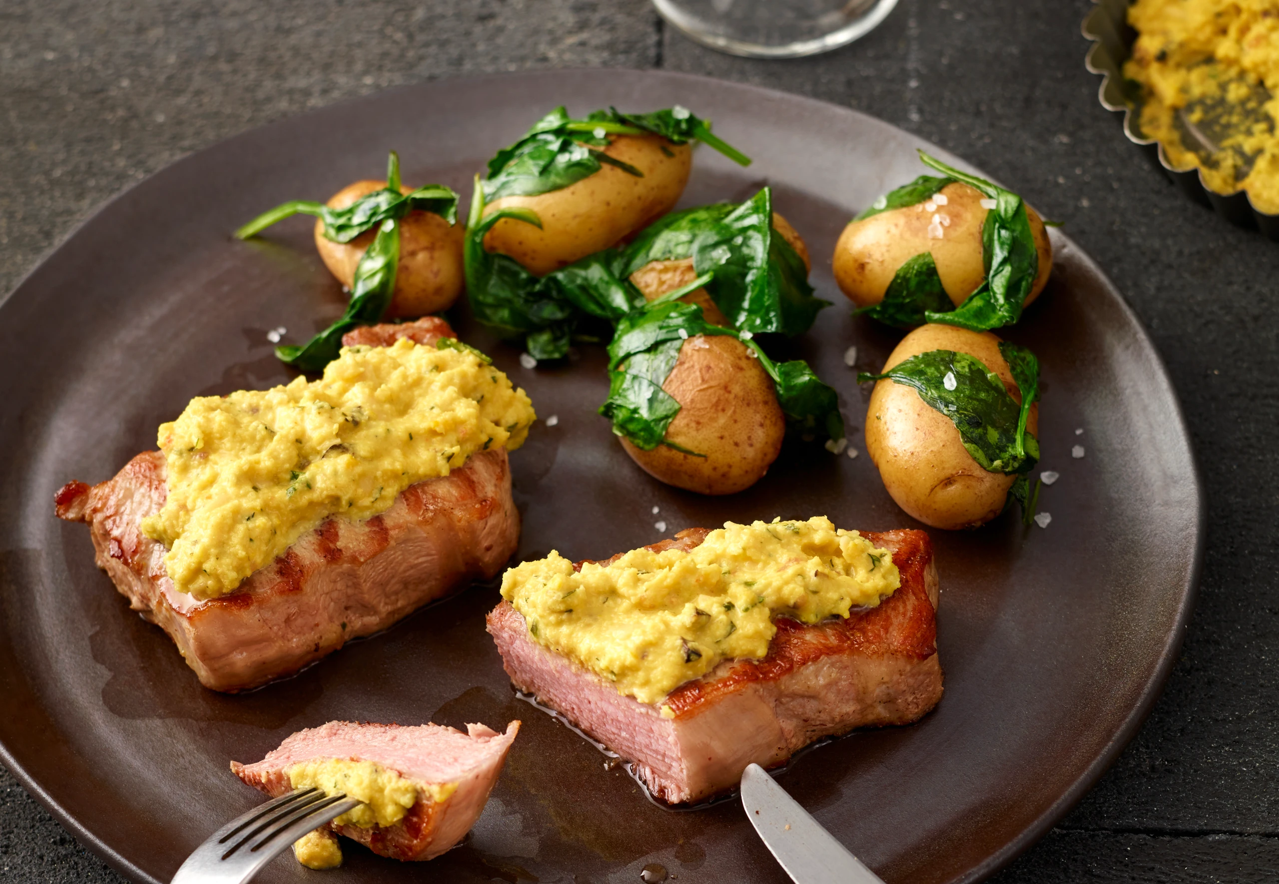Erdäpfel in Salzwasser bissfest kochen. Spinat waschen und abtropfen lassen. Kalbsfilet quer in 8 Medaillons schneiden und ein wenig flach drücken.