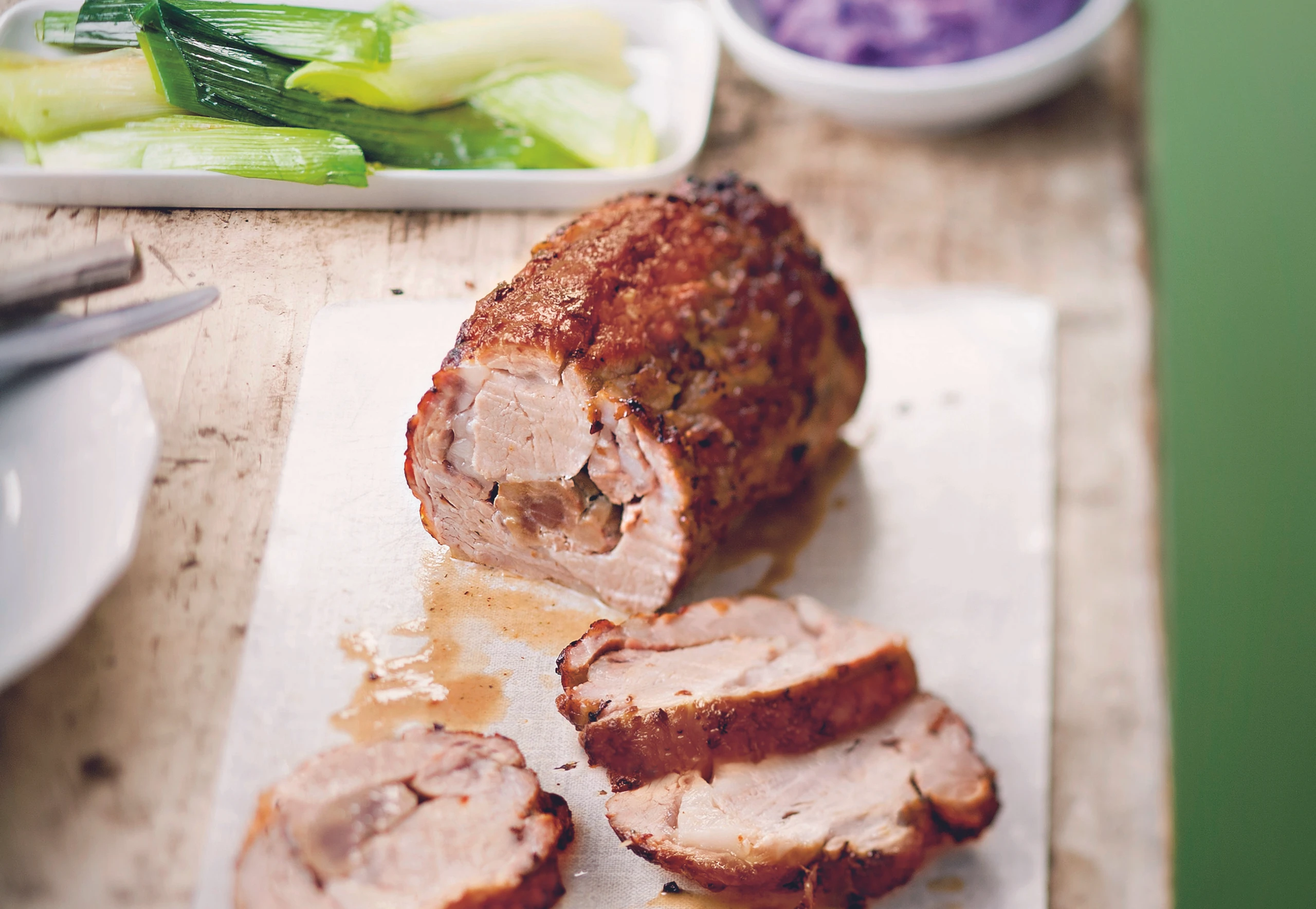 Braten herausnehmen, Spagat entfernen, Braten warm stellen. Bratrückstand mit Kalbsfond aufgießen, aufkochen und abseihen. Braten in ca. 2 cm dicke Scheiben schneiden, mit Honig-Lauch und Püree anrichten.