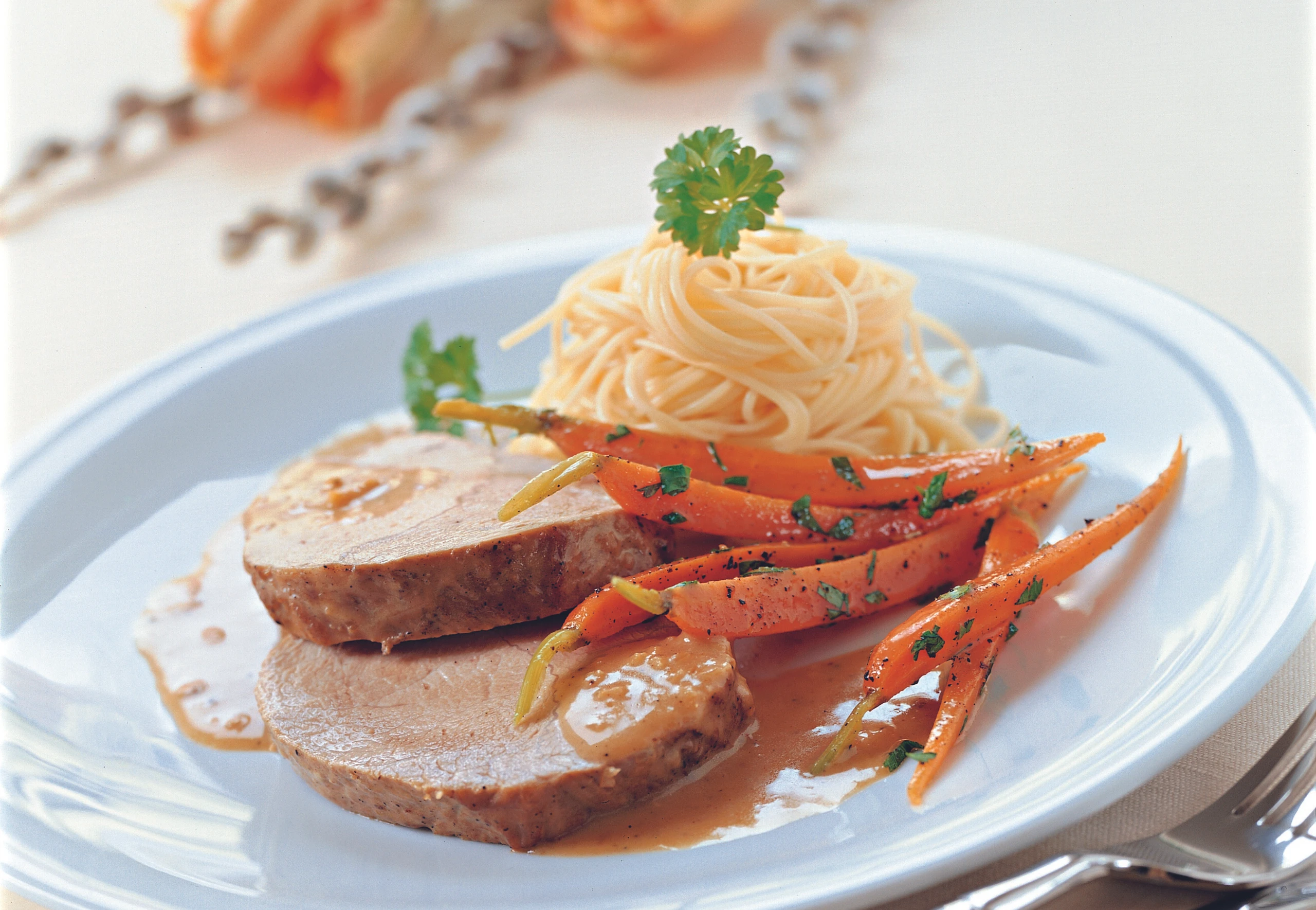 Fleisch in Scheiben schneiden und mit Sauce, Karotten und Nudeln anrichten.