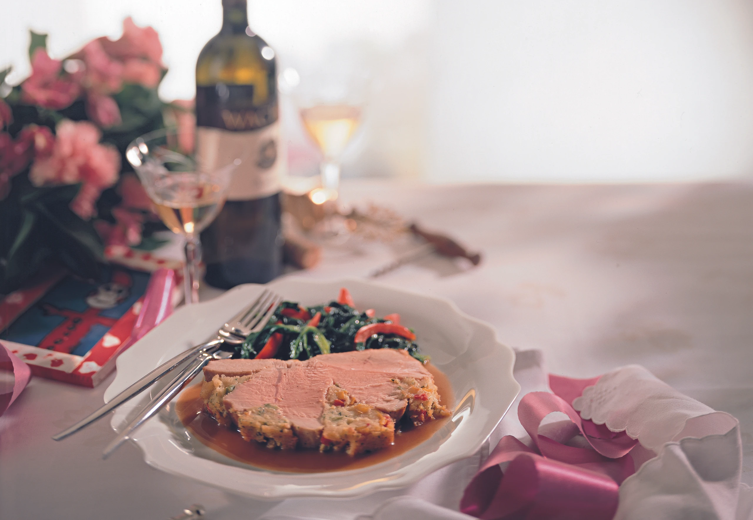 Kalbsnuss längs viermal zwei Drittel tief einschneiden. Fleisch rundum mit Salz und Pfeffer würzen und die Einschnitte mit der Grießmasse füllen.