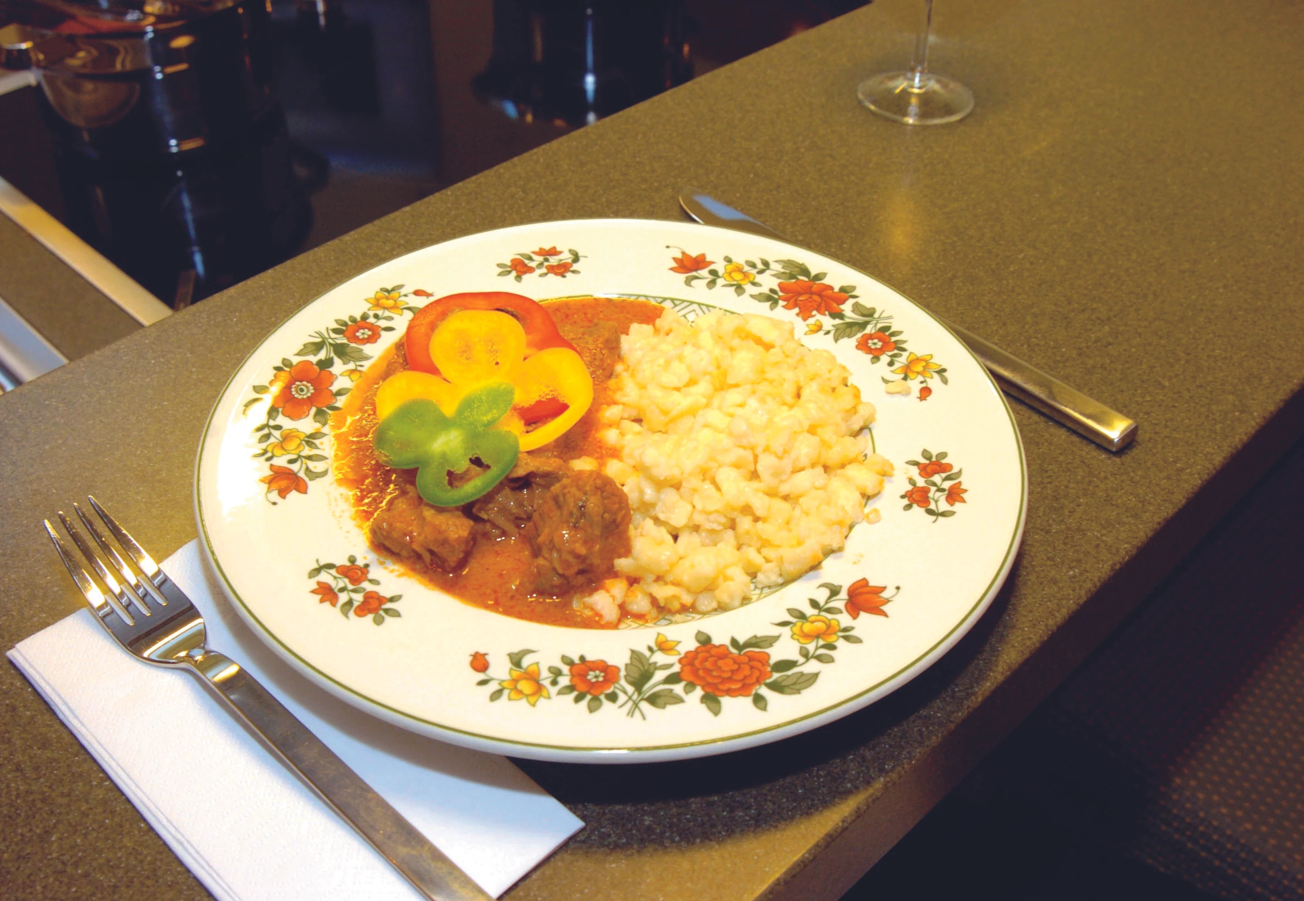 Obers und Sauerrahm in die Sauce rühren und ca. 4 Minuten köcheln. Kalbspörkelt mit Nockerln anrichten.