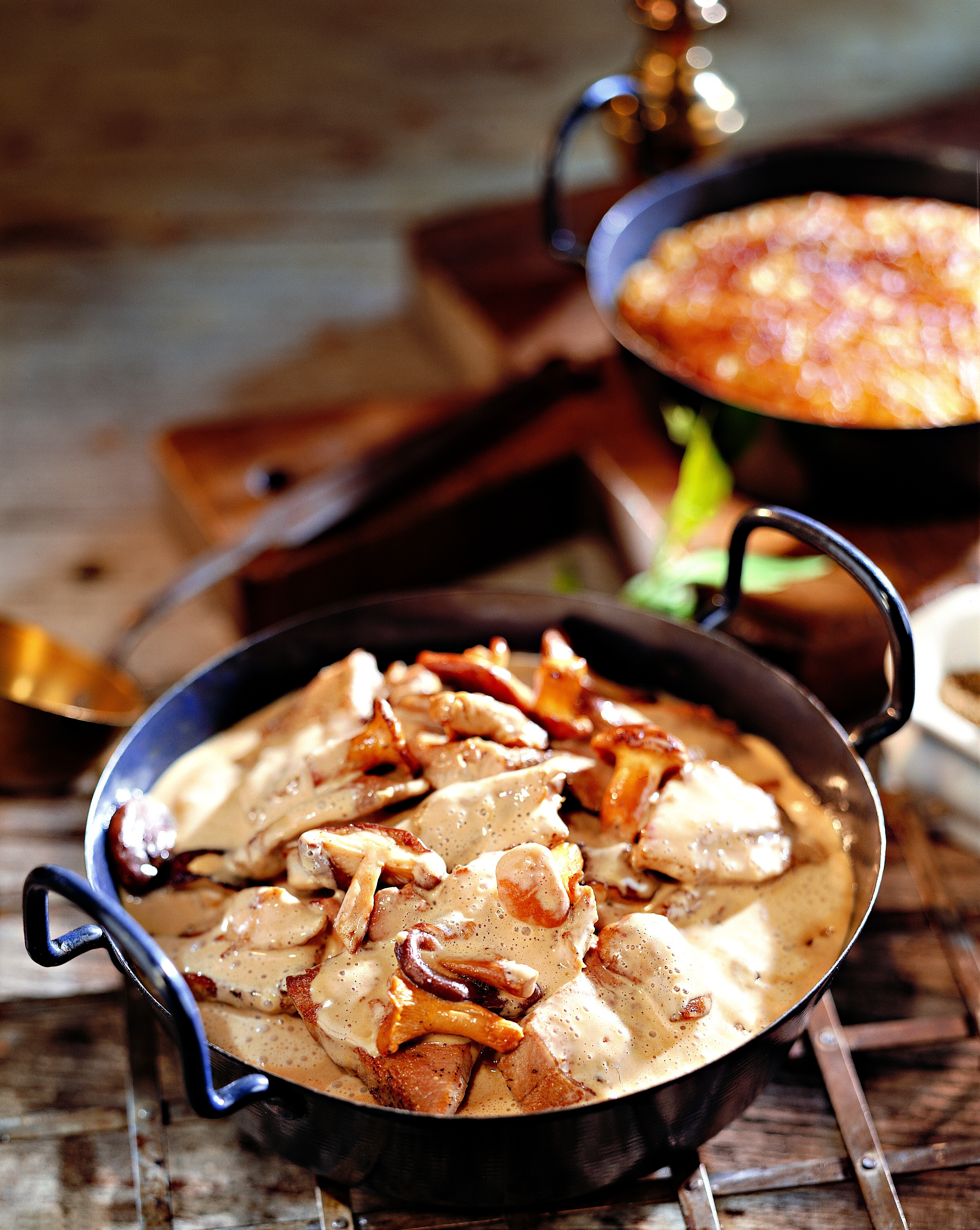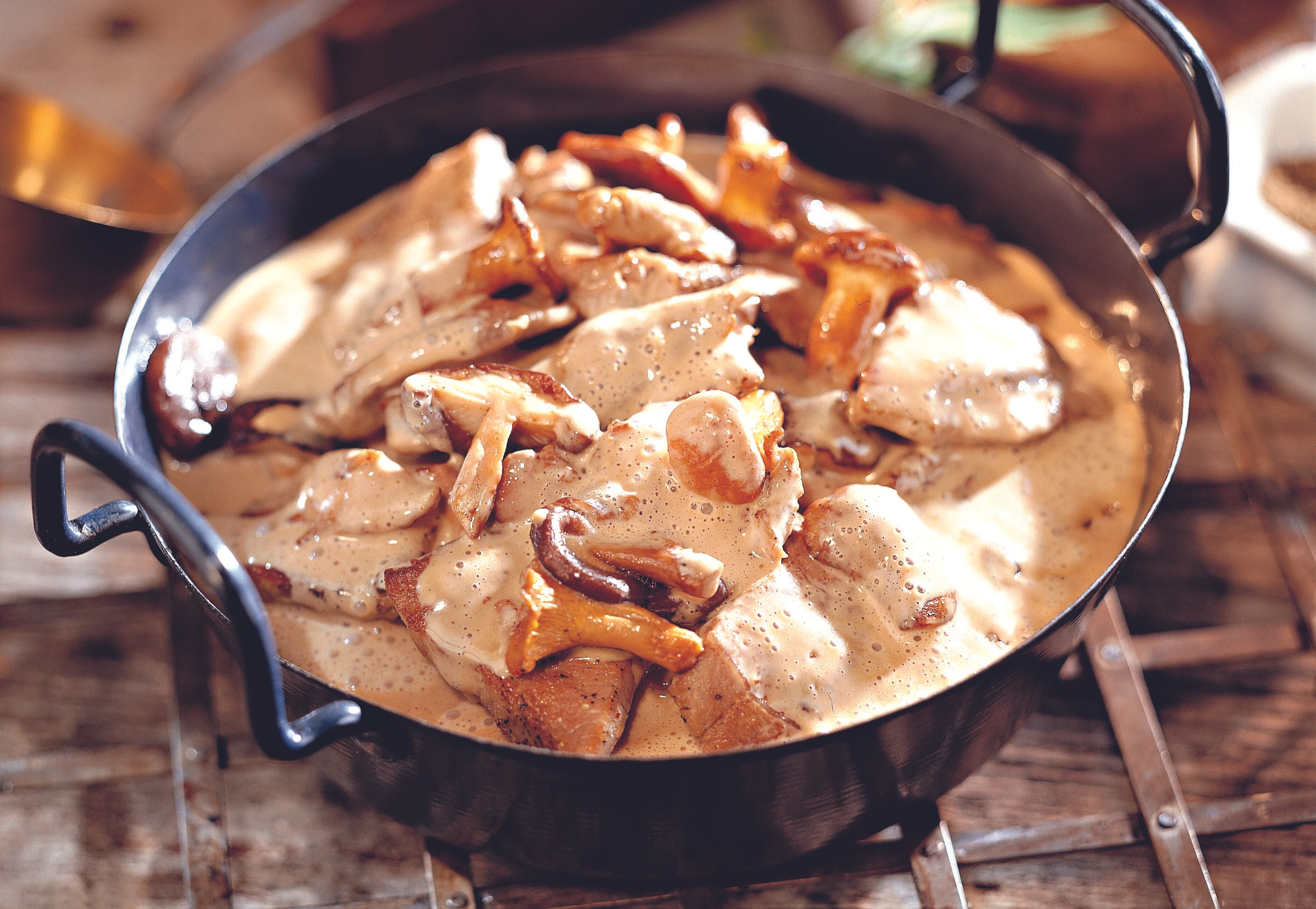 Fleisch mit Salz, Pfeffer und Cayennepfeffer würzen und im heißen Öl anbraten. Pilze zugeben, 2–3 Minuten mitbraten. Alles aus der Pfanne nehmen.