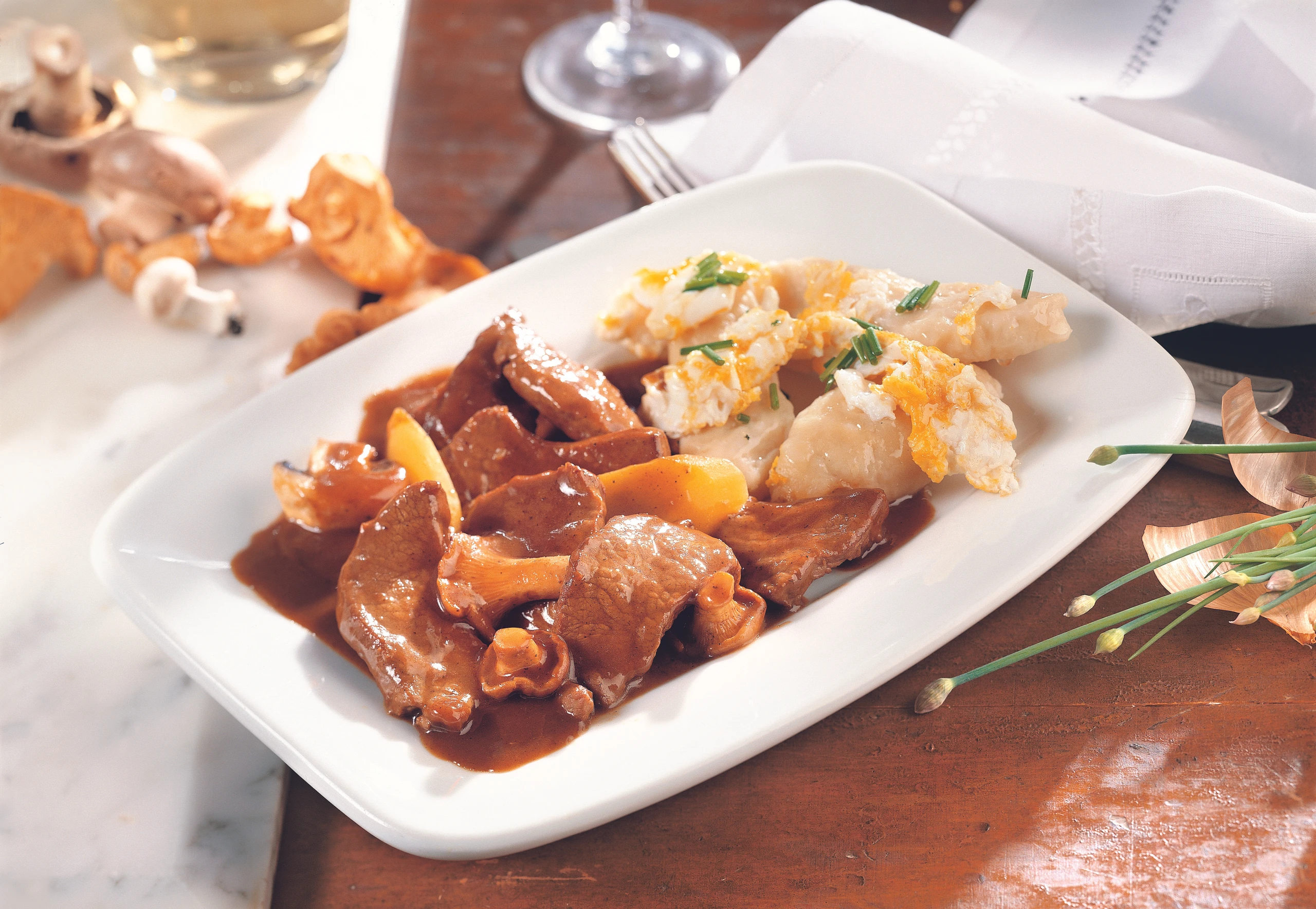 Kalbsschulter von Sehnen und Knorpeln befreien, Fleisch in fingerdicke Scheiben schneiden. Zwiebeln schälen und klein würfelig schneiden.