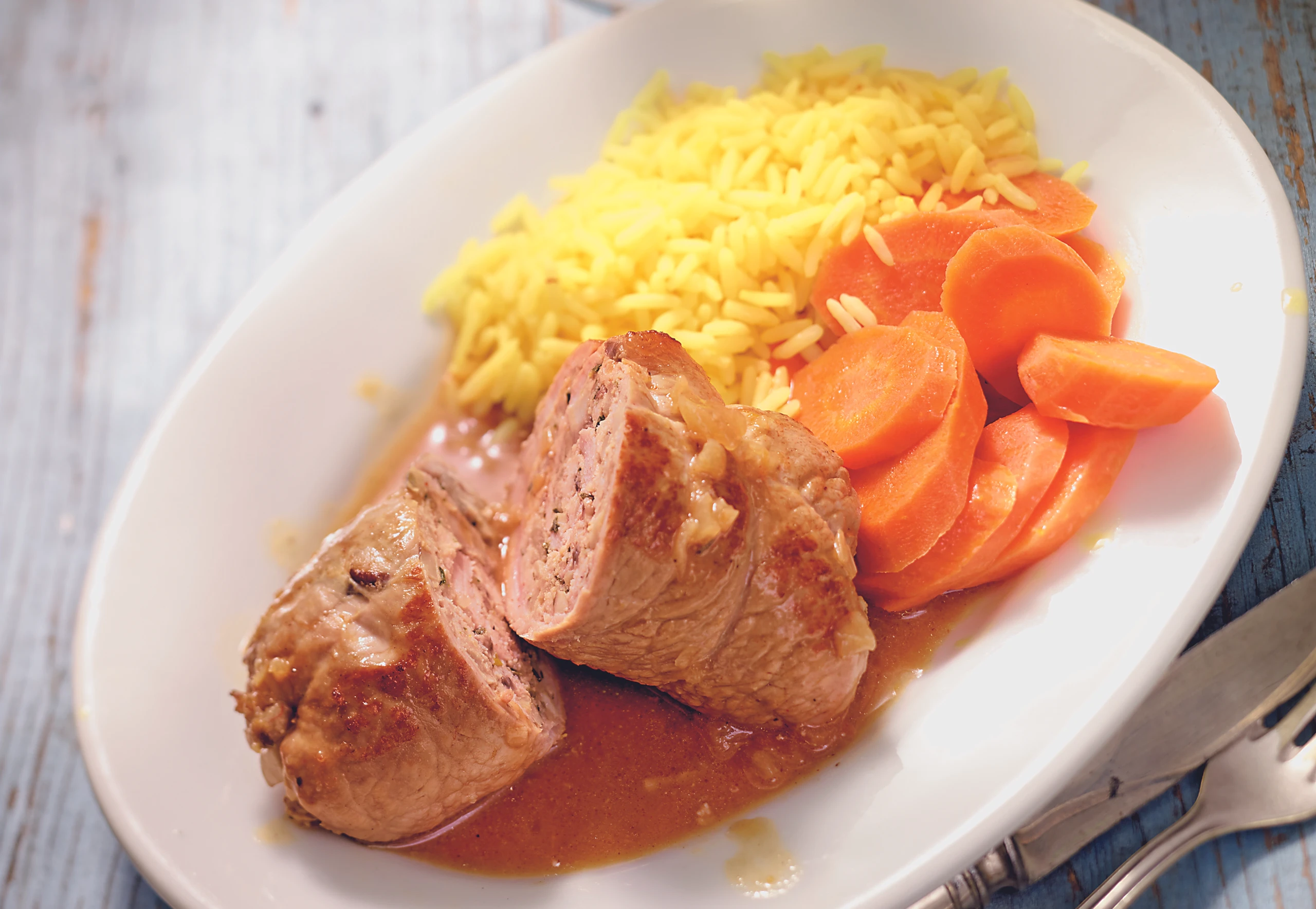 Von den Rouladen Spagat entfernen. Rouladen mit der Sauce anrichten. Als Beilage passen Safranreis und gedünstete Karotten.