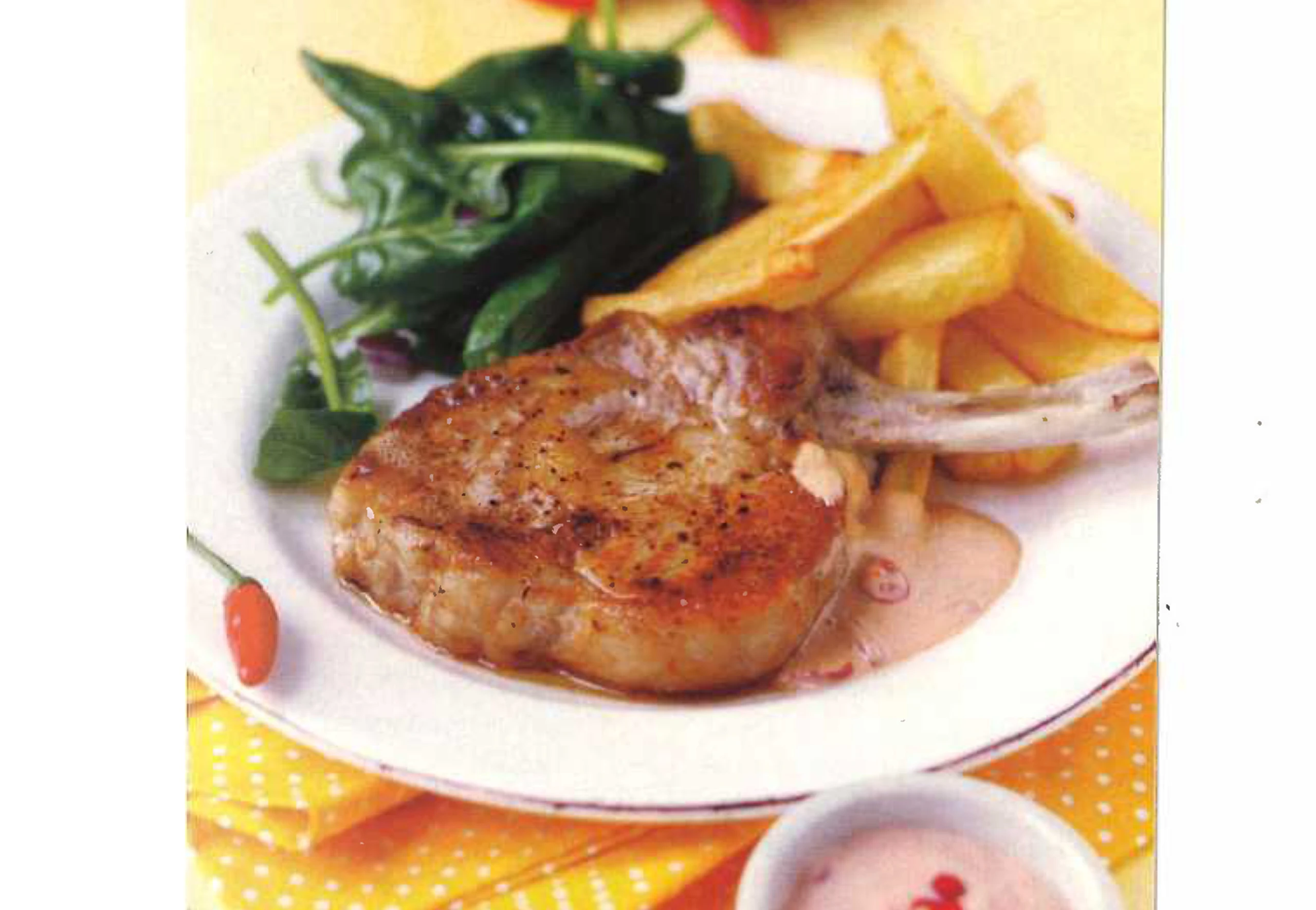 Rohr auf 160 °C vorheizen. Koteletts salzen, pfeffern und im Öl beidseitig anbraten. Im Rohr (untere Schiene / Gitterrost) fertig braten (ca. 8 Minuten); dabei öfters mit Bratfett übergießen. Fleisch nach halber Garzeit wenden.