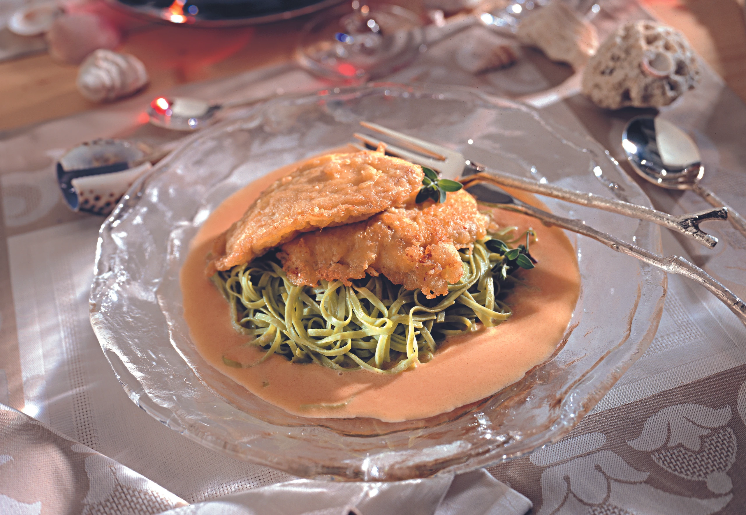 Kalbsschnitzel in Käsepanier auf Paradeissauce