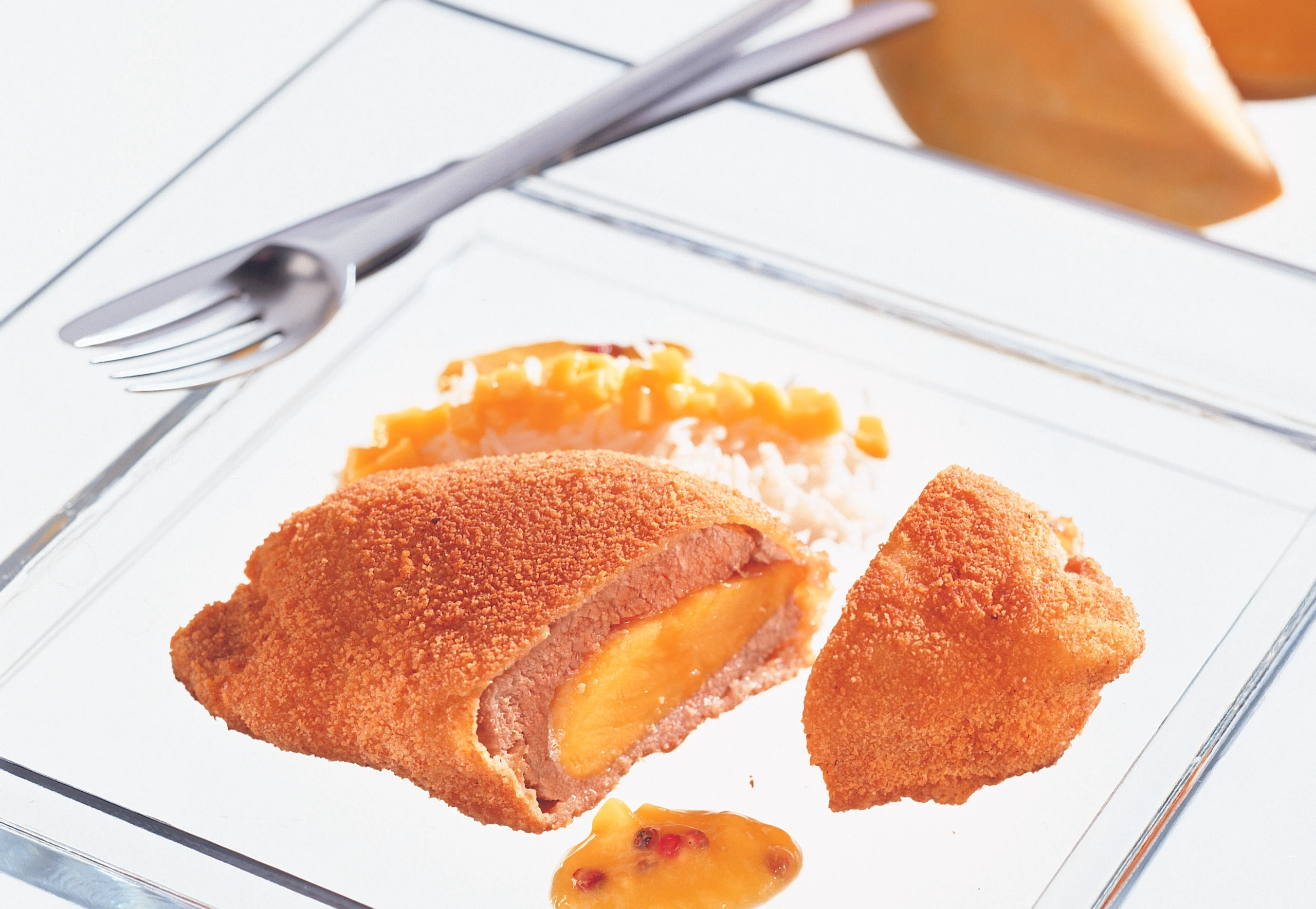 Kalbsschnitzel mit Mangofülle und Mango-Ingwerreis