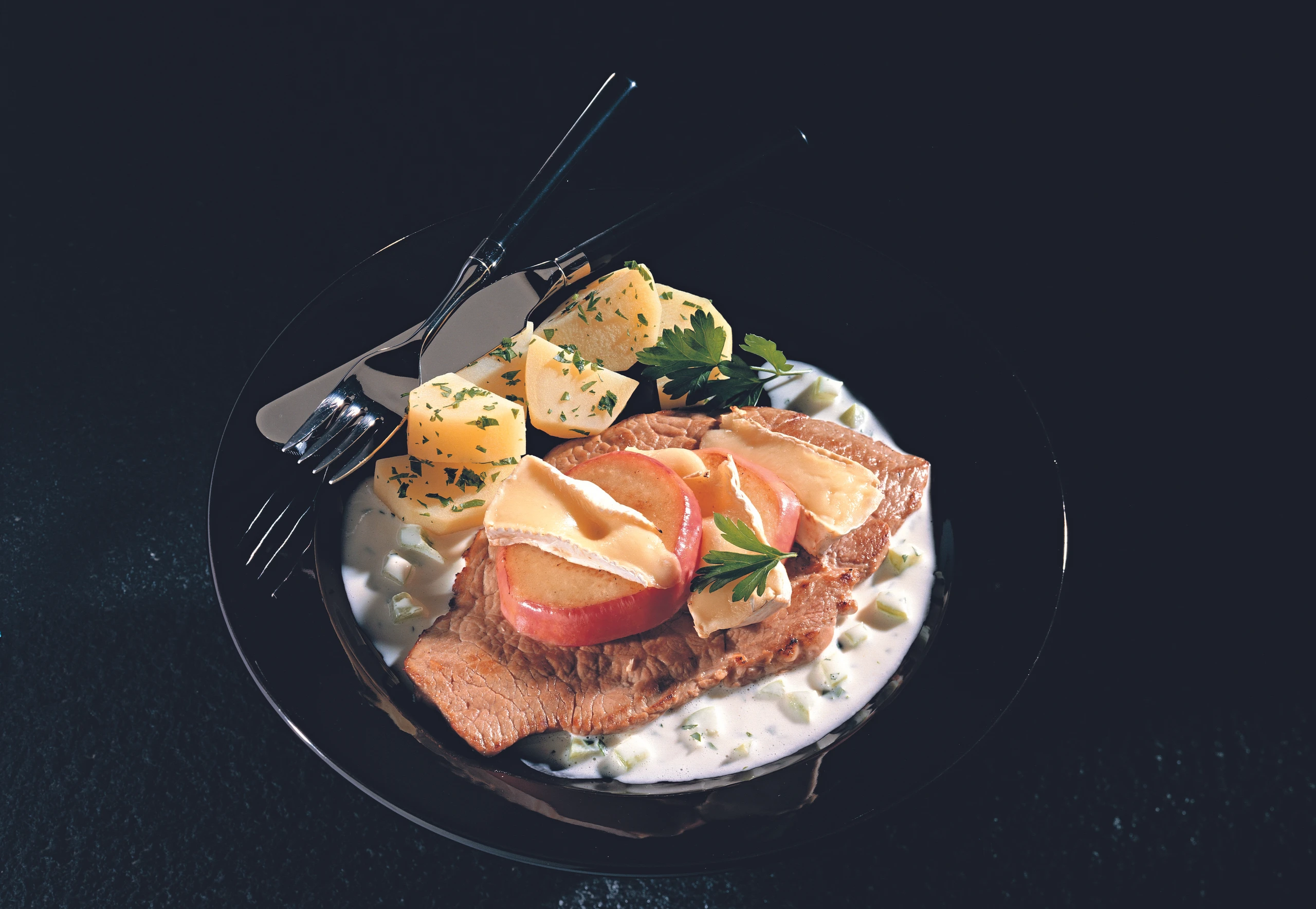 Kalbsschnitzel mit Äpfeln und Camembert überbacken