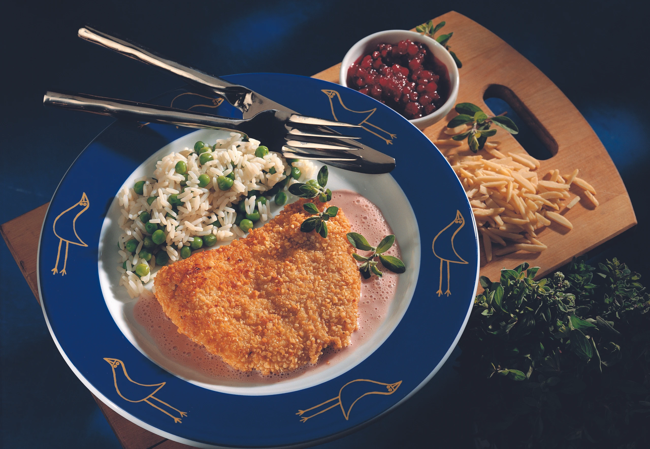 - Eier mit einer Gabel verschlagen. Schnitzel zwischen Frischhaltefolie legen, behutsam klopfen und mit Salz, Pfeffer und wenig Majoran würzen. Schnitzel in Mehl wenden, gut abschütteln, durch das Ei ziehen und in den Mandeln wenden.