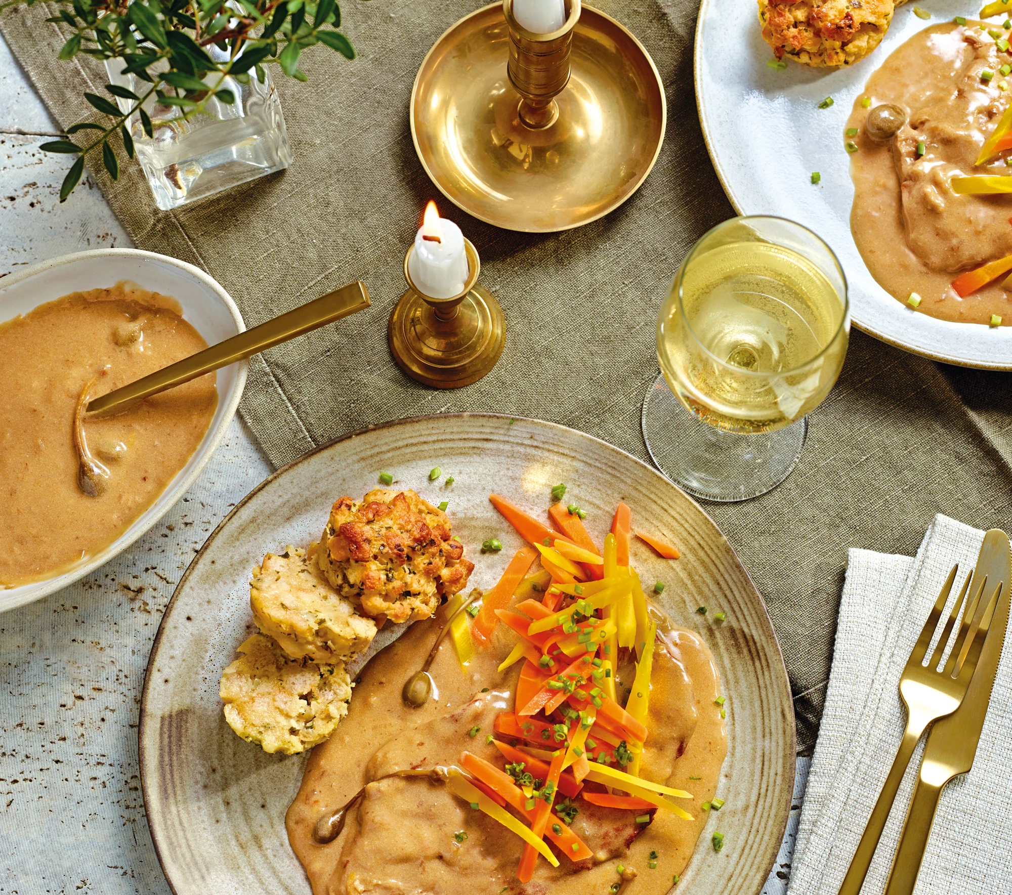 Kalbsschnitzel mit Rahmsauce und Semmelauflauf