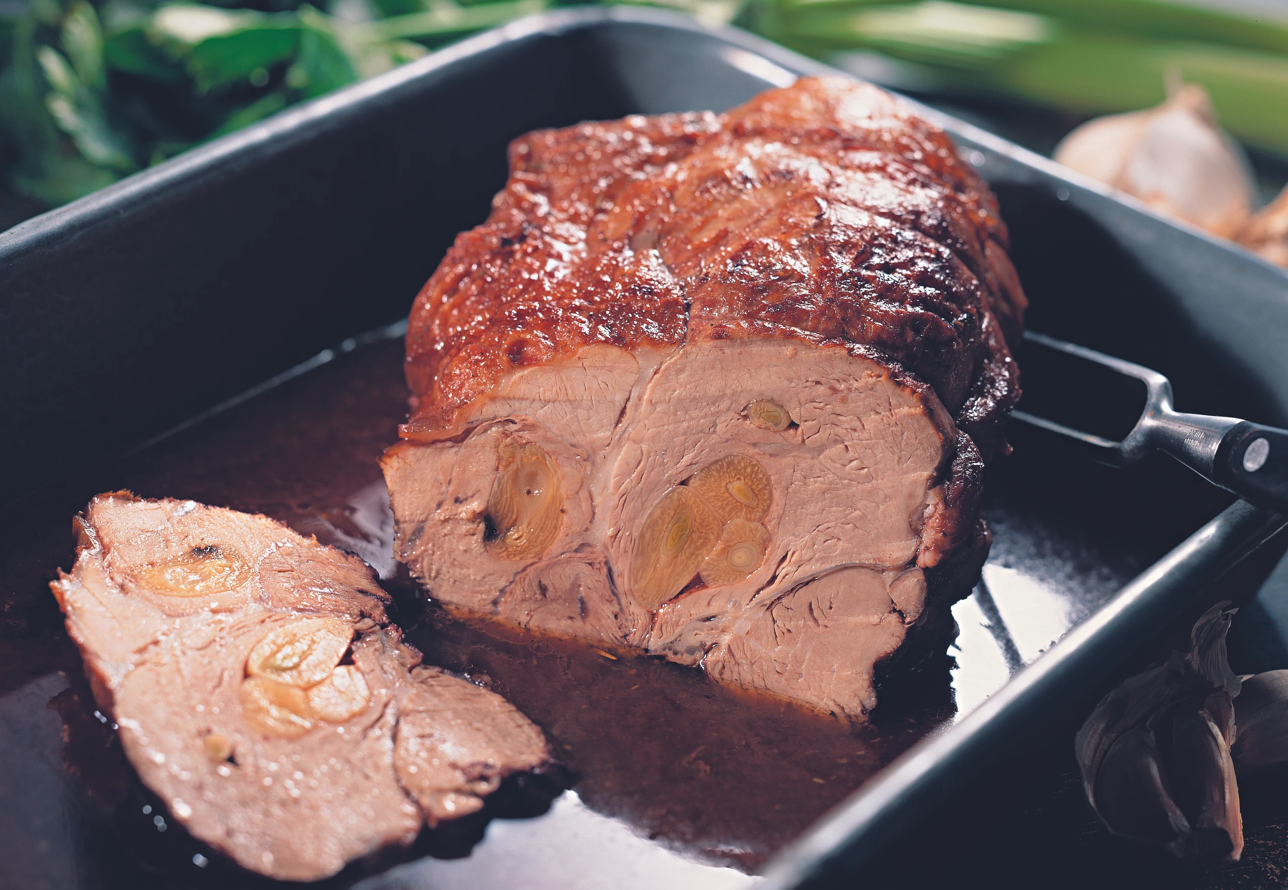 Wein abseihen, Gemüse in Öl anrösten, zum Fleisch geben und mit dem Wein begießen. Fleisch im vorgeheizten Rohr (unterste Schiene / Gitterrost) 2 Stunden braten.