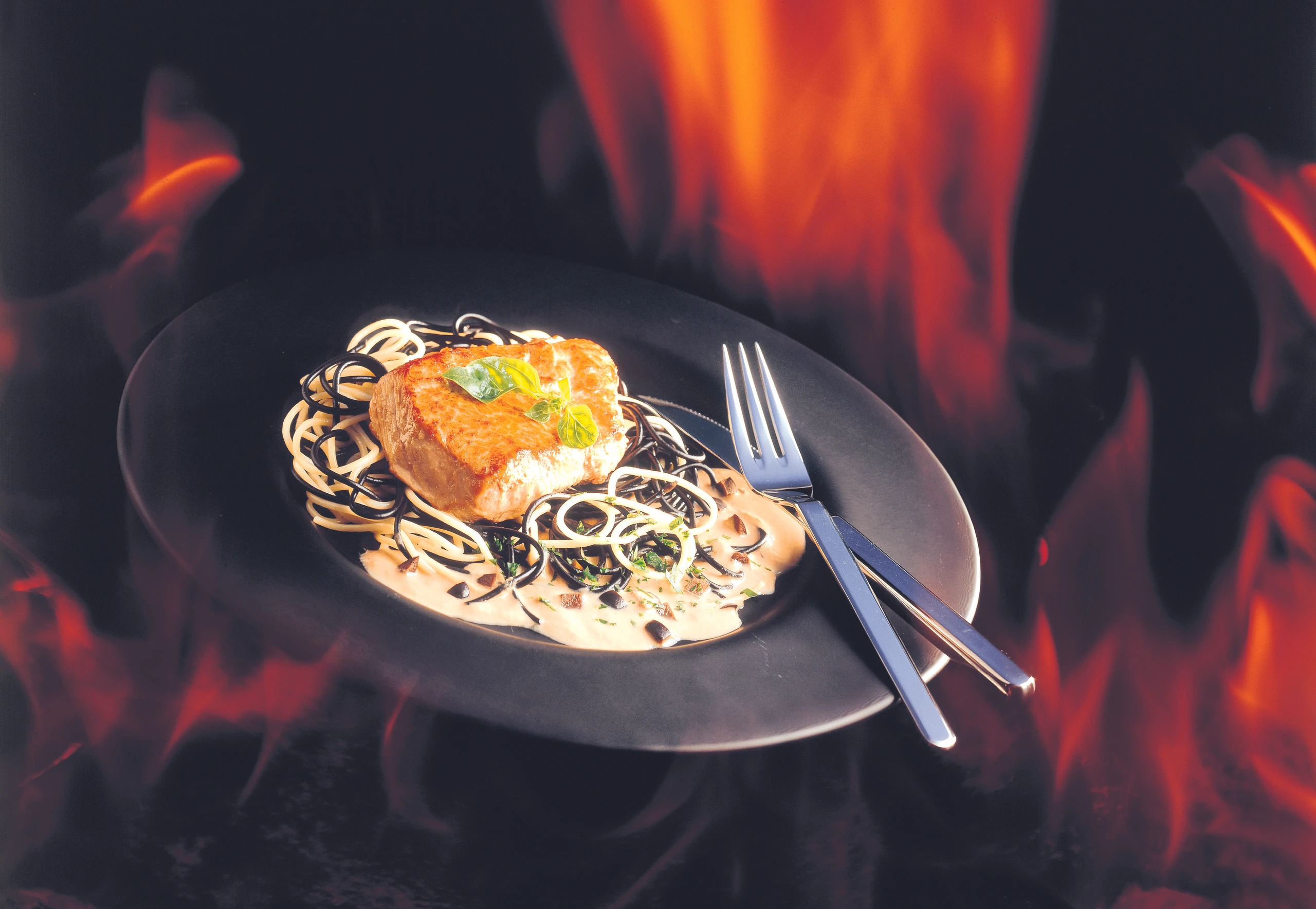 Basilikum in feine Streifen schneiden. Sauce mit Salz, Pfeffer und Zitronensaft würzen, Oliven und Basilikum einrühren. Steaks mit der Sauce auf Tellern anrichten, eventuell mit Basilikumblättern garnieren und mit Nudeln (siehe Rezept) servieren.