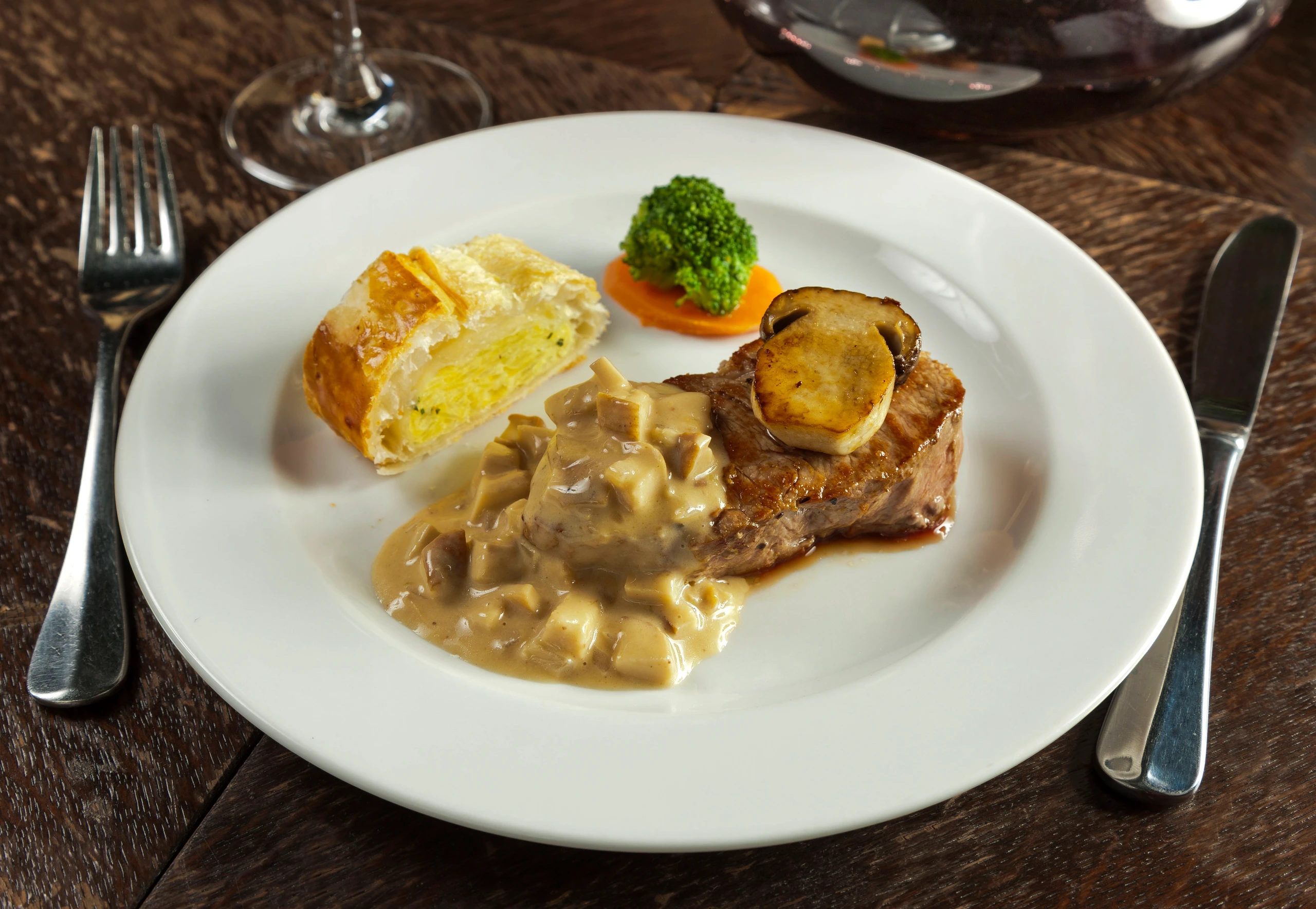 Kalbssteak mit Steinpilzsauce und Erdäpfelstrudel