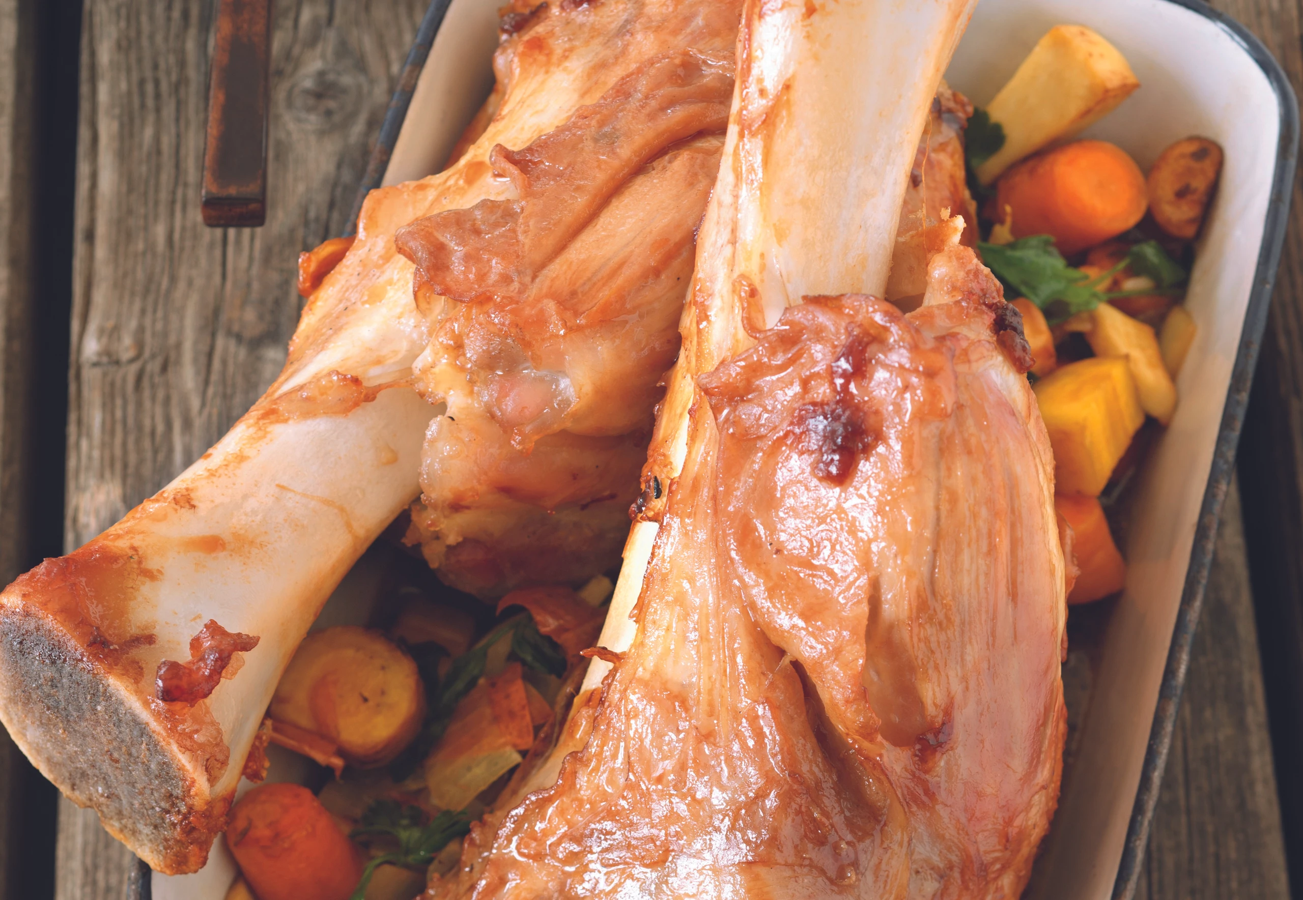 - Im Bratrückstand Gemüse anrösten. Stelzen darauf legen und im Rohr (untere Schiene / Gitterrost) ca. 2 Stunden braten; nach ca. 20 Minuten Bratzeit die Hälfte vom Kalbsfond zugießen. Übrigen Fond nach und nach zugeben. Stelzen nach halber Garzeit wenden.