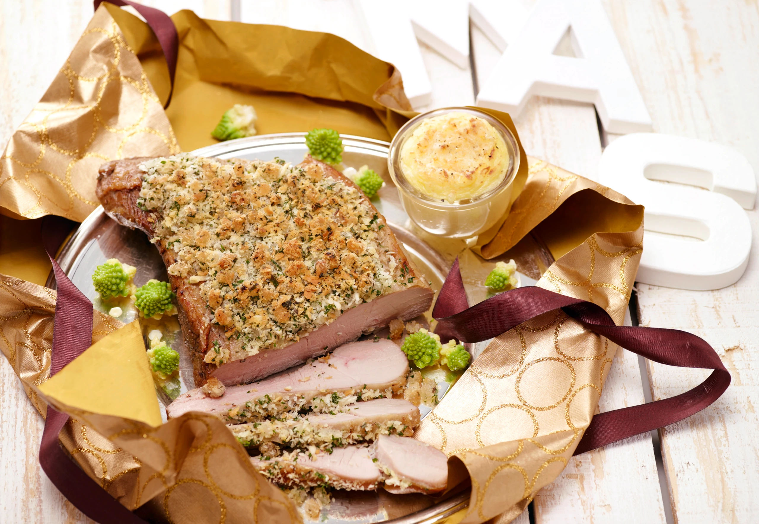 - Für die Kruste Toastbrot entrinden. Toastbrot und Lardo würfelig schneiden, Kräuter untermischen. Krustenmasse auf das Fleisch geben und gut andrücken. Rohr auf 220°C Oberhitze stellen, Braten 6 Minuten überbacken.